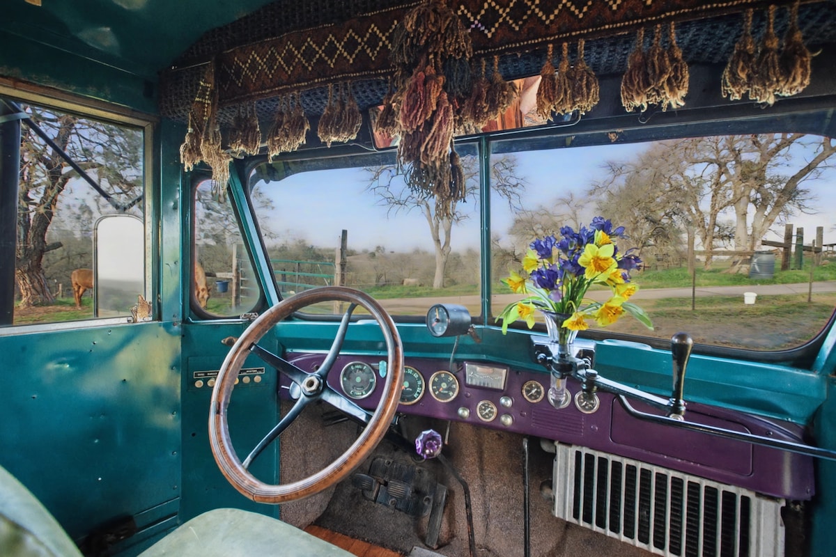 April 1st Update: This is a new listing! Next weeknight availability is: April 19th Next weekend availability is: April 18th Welcome to Grace, the Enchanted Bus — a handcrafted 1956 International Harvester school bus turned magical hilltop retreat. Nearly everything inside is wood or vintage metal. Grace has a second story with a bedroom and meditation loft (with a small mattress too). Perched on a hill with sweeping views of rolling countryside with horses that come right to the deck!