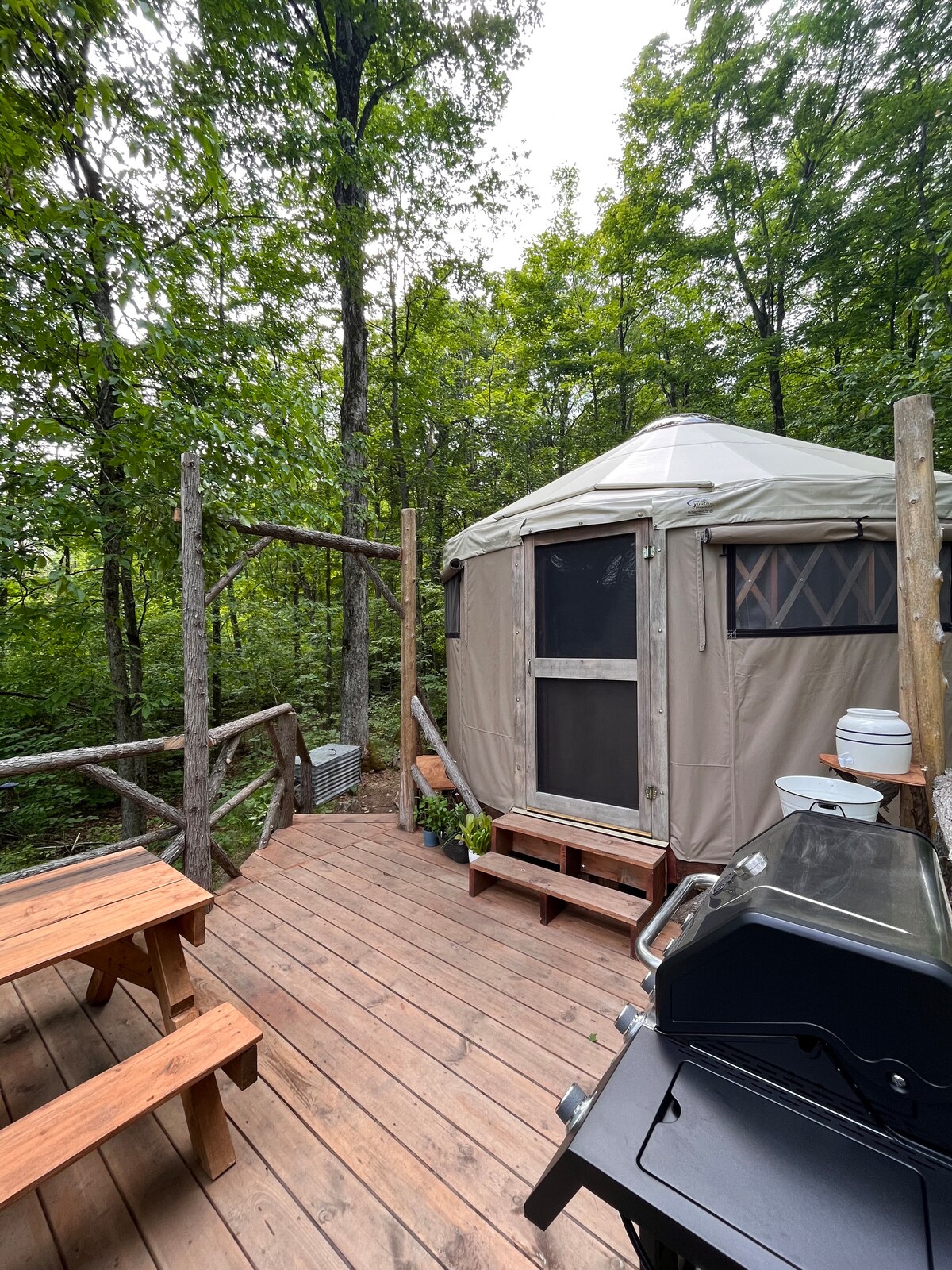 Юрта в приватній лісовій зоні. У пішій доступності сирний завод (морозиво, обіди, закуски), продуктові лавки та парк. Коротка поїздка до Мадока (продуктові магазини, пиво/LCBO, парки, пляж, пекарня, ресторани тощо). Ідеальне місце для спостереження за зірками, довгих прогулянок і велопрогулянок. Ця юрта знаходиться в кемпінгу, з компостним туалетом у приміщенні, сезонним приватним душем на відкритому повітрі, без Wi-Fi, але є електрика, посуд, плита в приміщенні, барбекю, міні-холодильник, всі каструлі та сковорідки, а також постіль та чиста питна вода.