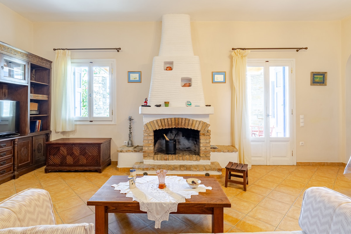 It's a cozy vacation home that can comfortably accommodate up to 7 people. The house has a panoramic view over the infinite blue of the Aegean Sea. Our home is ideally located if you are seeking to relax and discover the island of Andros. It’s located in a peaceful spot in the area of Agios Petros that is only 6 minutes away from some of the most beautiful beaches and the port of Gavrio. We are always glad to assist our guests so that they can explore the little gems of the island.