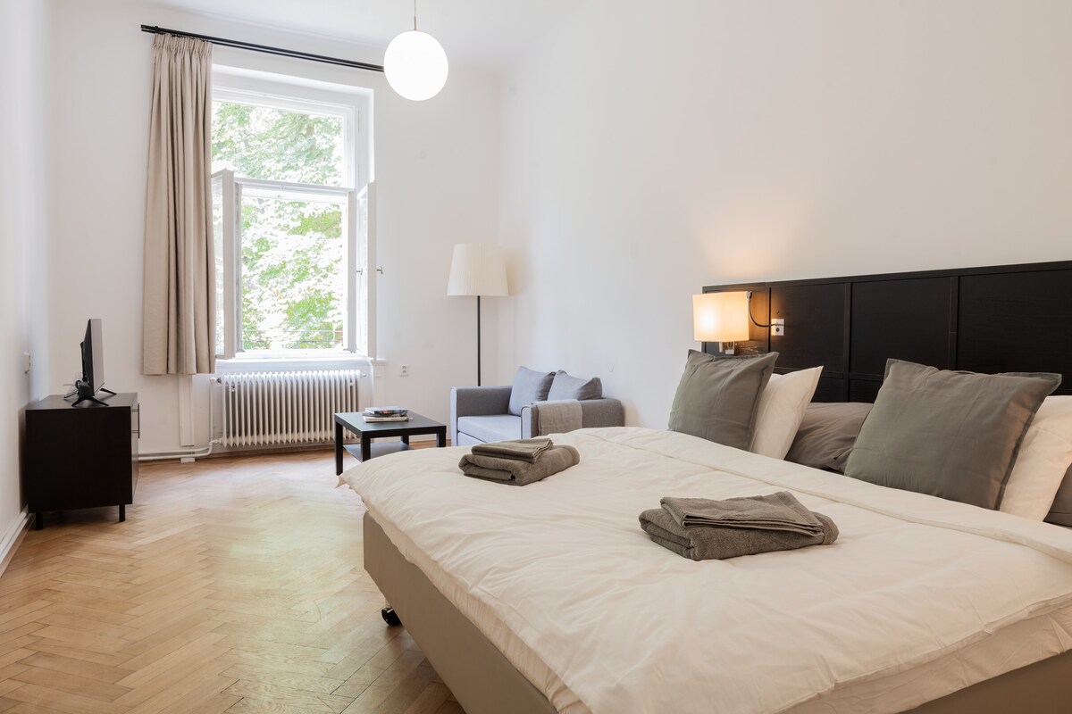 Це квартира вашої мрії в Празі! ✨ Ознайомтеся з нашими дивовижними відгуками! Ми пропонуємо красиву квартиру з 2 спальнями, просторою вітальнею та кухнею (120 м²) в історичній будівлі з ліфтом. Нещодавно відремонтований, елегантно мебльований, повністю кондиціонований і обладнаний для вашого ідеального перебування. Розташоване прямо в центрі Праги, всього в декількох хвилинах ходьби від Карлового мосту, Танцювального будинку, пагорба Петрін, Празького града та 5-зіркового торгового центру Novy Smichov. Ви закохаєтеся в цю оселю!
