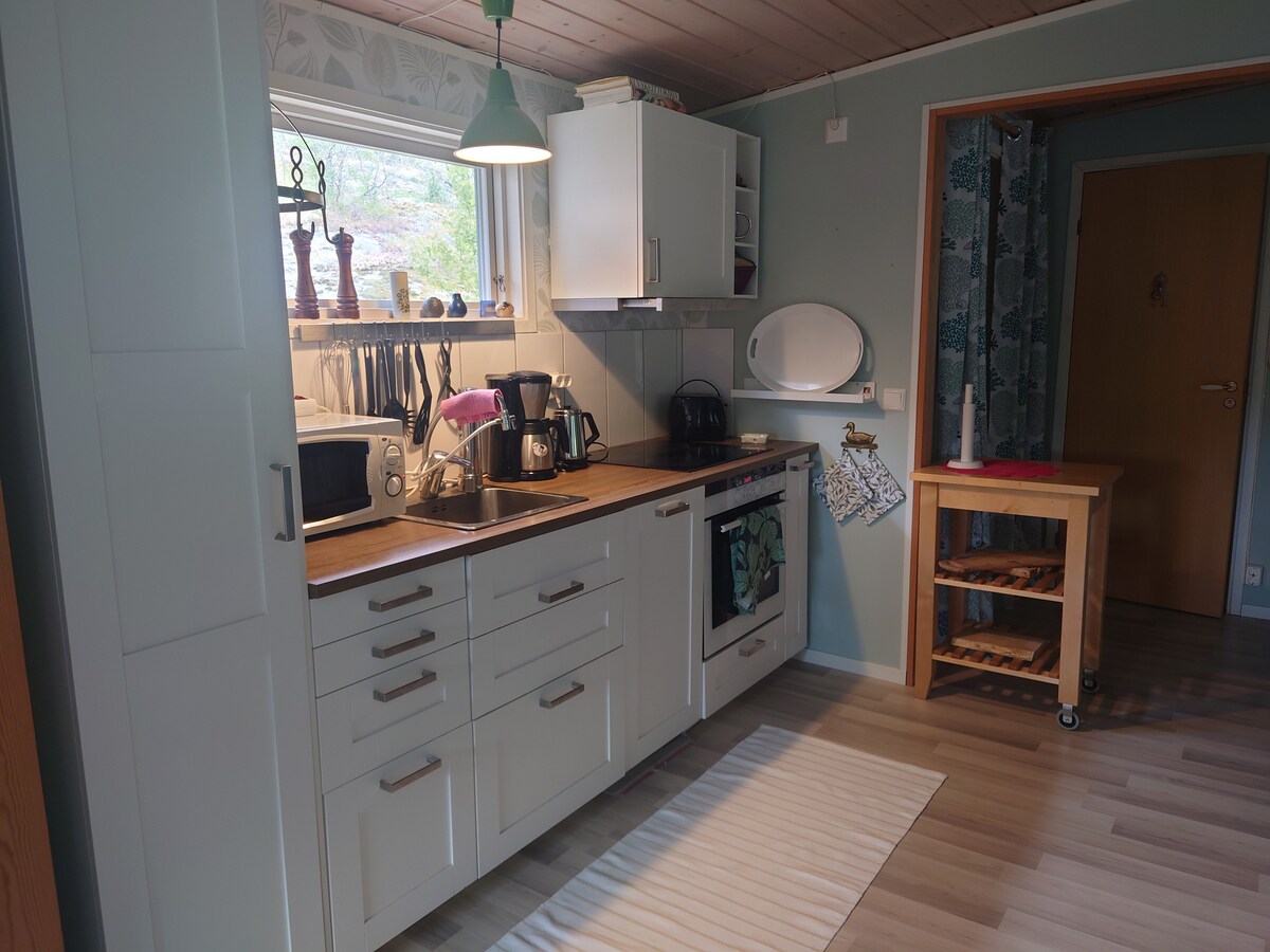 Тут ви живете на чудовій природі і всього в 4,2 км від центру Стремстада. У будинку є окремі будівлі для спалень, кухня/вітальня та туалет. 2 телевізора з плоским екраном і вбудованим Chromecast. Спальні зони розділені на 2 чудові односпальні ліжка у спальні та один двоспальний диван-ліжко на кухні. Поруч із пляжем, гольфом, а також магазинами на норвезькому кордоні тощо.
