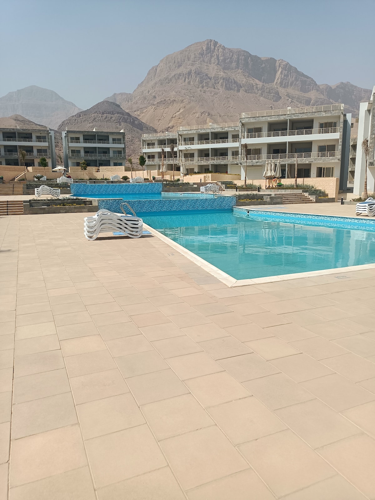 2 big bedrooms, 1 big reciption +2 toilets Sea , pool & mountin view Fully air conditioned , , bbq on beach servies , washin machine house keeping & supermarket is available + Near by recriations center (porto sokhna) Free parking is available. Note: Hijab and borkini is not allowed by the swimming pool.
