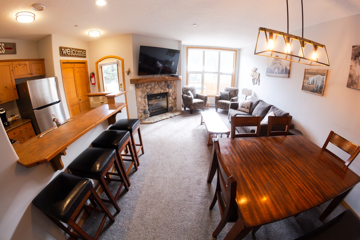 Відпочиньте і розслабтеся в цьому спокійному, стильному помешканні. 2 спальні, 2 ванні кімнати, кут/кінцевий блок. Буквально на лижах і на лижах на дверях до східного крісельного підйомника. Гідромасажна ванна. Барбекю. Ліжка Queen Size в обох спальнях. Дві ванні кімнати з туалетом. Сучасна кухня з гранітними стільницями та побутова техніка з нержавіючої сталі. Яскрава вітальня з 9-футовими стелями з затишним газовим каміном з видом на гори. Шафка для зберігання біля входу для зберігання спорядження. За кілька кроків можна дістатися до гірськолижного спорту на альпійських та скандинавських лижах, їдальні та багато іншого.