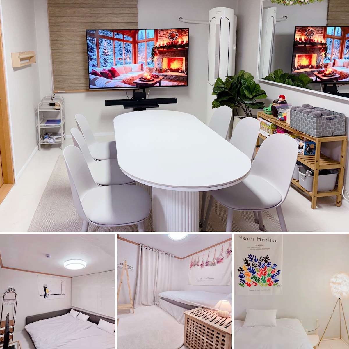 [눈꽃]이번에 새롭게 증축한 신축건물로 아늑하고 화사한 스타일 넘치는 공간이 어우러져 친구들/가족들과 함께 즐거운 시간을 보내기에 좋은 55평형 집입니다. 리조트 느낌을 주는 거실에서 주방까지 넓은 공간으로 여러 명이 함께 머물기에 적합하며,부드러운 베이지컬러와 엔틱한 소품들이 조화롭게 어우러져 따뜻하고 깔끔한 숙소입니다. 한 집을 통째로 사용할 수 있으며 가까이 주인이 상주하여 매우 관리가 잘 되어있습니다. 숙소 내에는 커다란 빔프로젝터가 준비되어 있습니다. 커다란 테이블이 주방과 루프탑에 준비되어있으며 세탁기와 건조기, 커피머신,정수기, 블루투스스피커까지 모두 구비되어 있습니다. 방은 총 3개이며, 고급 매트리스와 호텔식 베딩으로 셋팅하였습니다. 어메니티가 모두 구비되어 있는 욕실은 3개로 불편함 없이 사용이 가능합니다. 넓은 거실과 루프탑에 다 함께 모여 즐거운 추억을 남겨보세요:) *반려동물 입실 불가합니다. *이 외 궁금하신 점은 언제든지 문의주세요;)