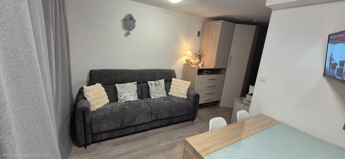 Гарна відремонтована студія площею 17 кв. м. Студія складається з входу з шафою, 1 ванної кімнати з душем, раковиною та туалетом, 1 відкритої кухні, обладнаної усім необхідним. вітальня зі столом, стільцями та телевізором, 1 диван-ліжко (новий) у 160 і двоярусне ліжко (нове) у 90 Вид на гори, безкоштовна парковка. На 9-му поверсі з ліфтом резиденція знаходиться біля підніжжя схилів з усіма магазинами (ресторан, магазин, прокат лиж та інші) в будівлі.