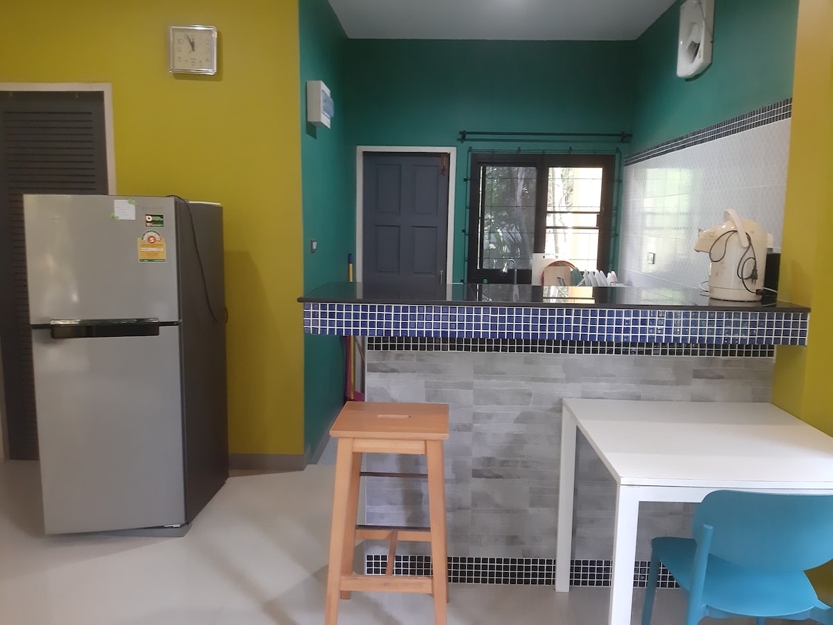 Вітаємо! У нас є окрема плата за комунальні послуги, окрім орендної плати за будинок, яку слід врахувати перед бронюванням. Плата за електроенергію: 8 батів за кіловат-годину; плата за воду: 45 батів за кубометр; плата за газ: 550 батів, якщо ви хочете готувати їжу; а також страховий депозит у розмірі 5 000 батів для довгострокового перебування та 3 000 батів для короткострокового перебування, який повертається під час виїзду. Затишне помешкання. Будинок розташований біля моря. Це окремий будинок у сучасному стилі з 2 спальнями, розташований усього за 5–10 хвилин ходьби від пляжу. Він розташований за 15 хвилин ходьби від магазину побутових товарів і за 20 хвилин ходьби від ринку свіжих продуктів, Lotus Express і Big C Mini. Увечері ви можете прогулятися головною дорогою, по обидва боки якої розташовані кіоски з вуличною їжею.