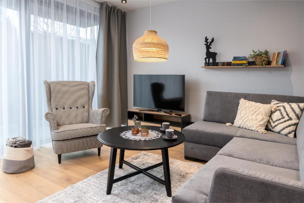 Для вашого відпочинку ми пропонуємо 62-метрову квартиру з двома спальнями (в одній ліжко 160х200, в іншій два односпальні ліжка 80х200), а також розкладним диваном у вітальні та власною ІЧ-сауною у ванній кімнаті. У вітальні є газовий камін, стіл на 6 осіб та повністю обладнана кухня (кавоварка, посудомийна машина, мікрохвильова піч, духовка, каструлі та посуд). З вікон кожної кімнати відкривається чудовий вид на Скричне. До апартаментів належать 2 приватні паркувальні місця.