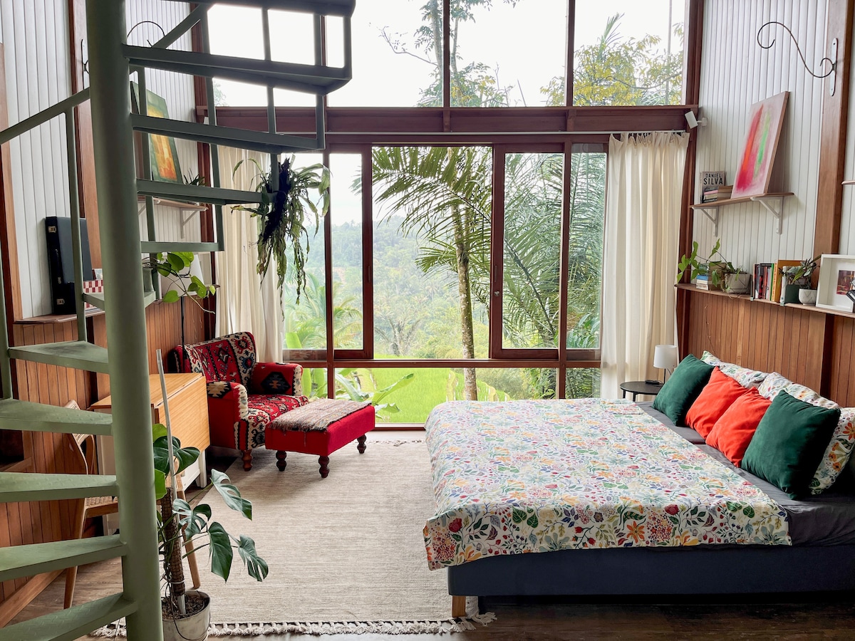 Відпочиньте в перетвореному балійському будиночку в центрі пишних джунглів. Колись тут були священики, а тепер – мистецький простір для проведення заходів, занять йогою тощо. Пориньте в обійми природи, оточені храмами, водоспадами та справжніми джунглями. Ваша подорож до спокою починається тут. Зупиніться в будинку в балійському стилі з дивовижною вентиляцією та видом на головного храму. Зверніть увагу, що ви перебуваєте в балійському святилищі посеред джунглів.