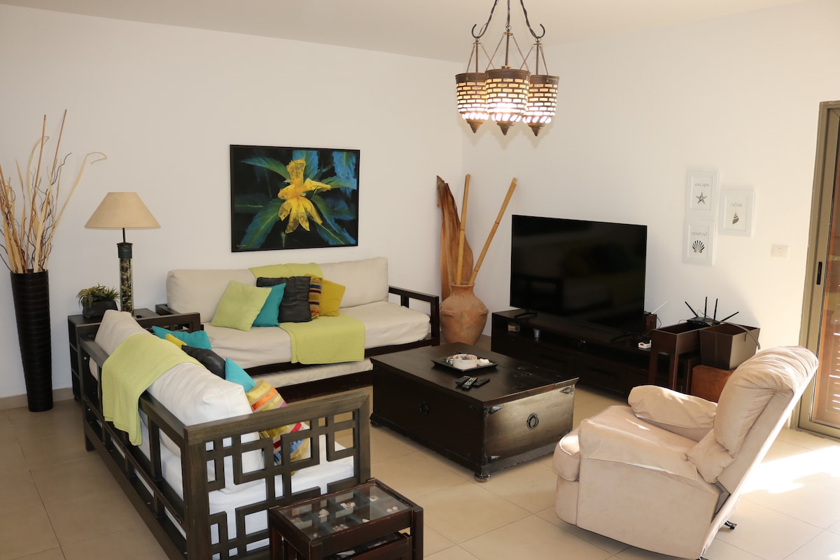 Сучасна розкішна зручна та чиста квартира. Він має 3 спальні та 2 ванні кімнати, розташовані на КУРОРТІ "ТАЛА-БЕЙ АКАБА ДЖОРДАН". Він має два виходи: один з них до пляжу, а інший безпосередньо до басейну та терас. Він також має велику вітальню з терасою, а квартира обладнана усім необхідним під час вашого перебування, таким як кухня, обідня зона, телевізор, інтернет, пральна машина та духовка. Все повністю відокремлено, спільних приміщень немає.