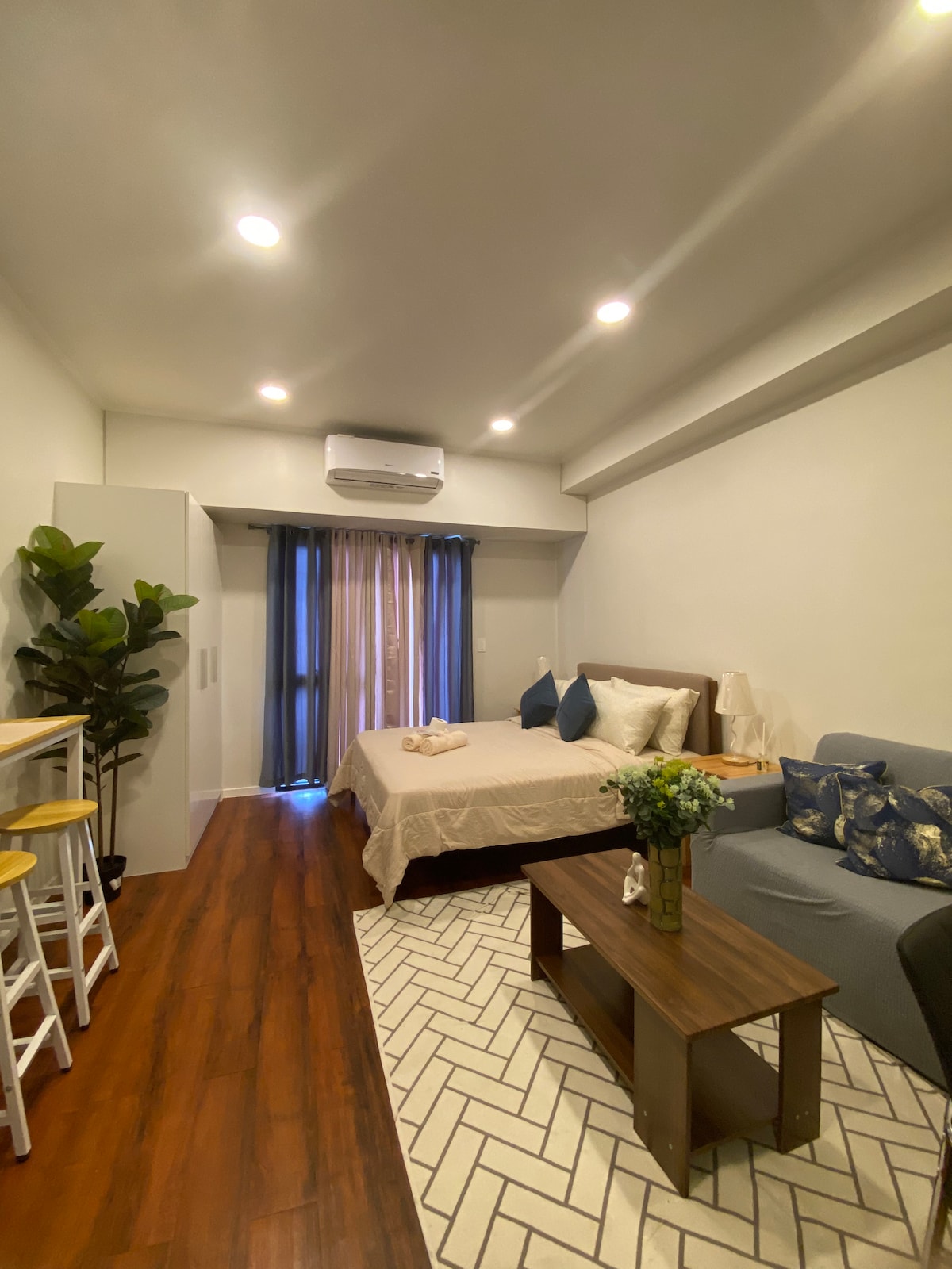 Relax and unwind in this comfortable and spacious one-bedroom condo in the heart of Davao City. Enjoy the stylish Condo and amenities it comes with it: ✅ Paid Car Parking ✅ unlimited WiFi ✅ 2 smart Tv with Netflix ✅ Washer and Dryer ✅ Cozy Bedroom w/ Queen size Bed ✅ Office desk w/Chair ✅ hardwood Dinning table and Chairs ✅ complete kitchen equipment ✅ microwave, water dispenser, Rice Cooker, water heater And More.