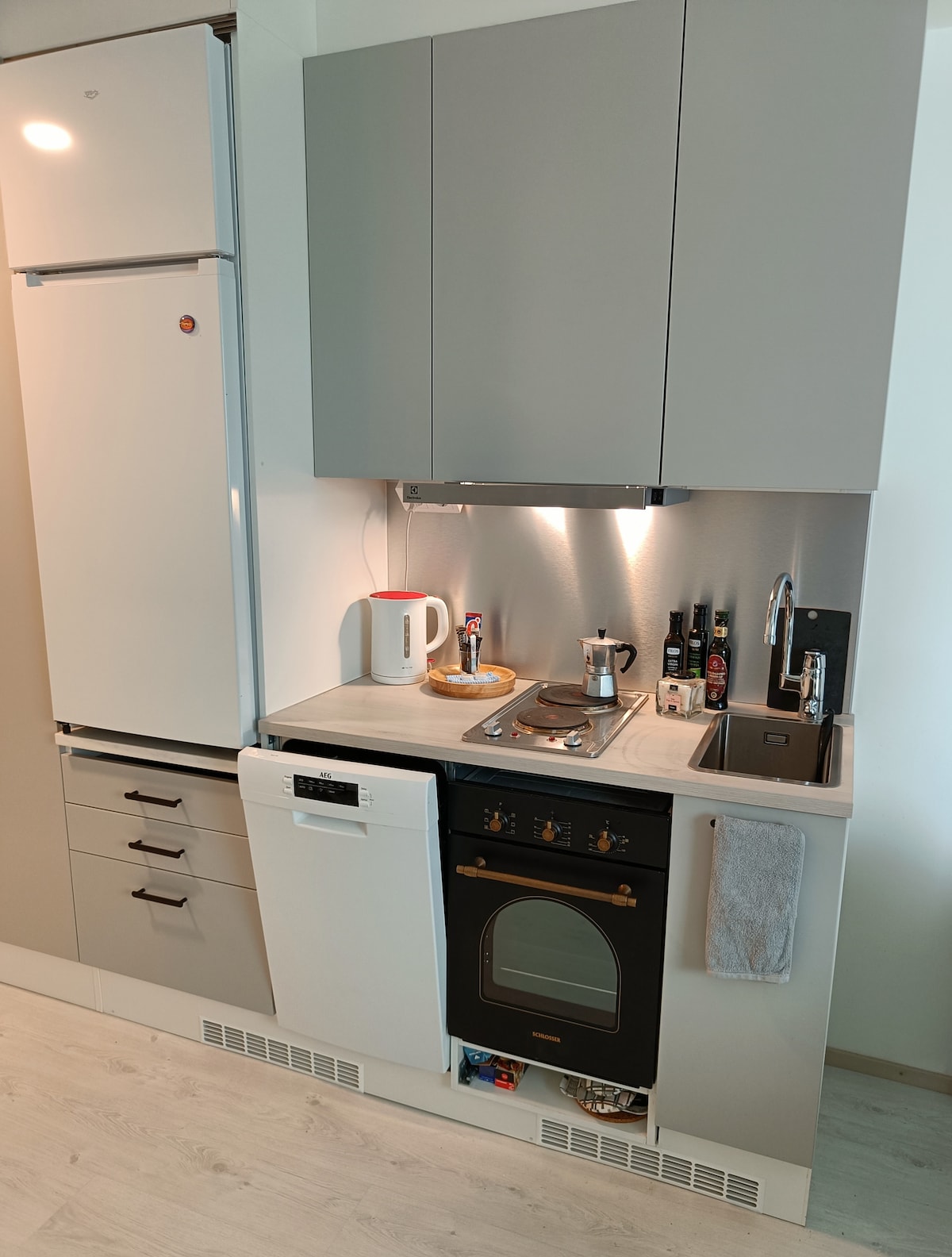 Чудове розташування в центрі Тампере! Всього в 50 метрах від головного входу нової Nokia Arena, в 100 метрах від залізничного та автобусного вокзалів. Усі послуги та пам 'ятки, всі ресторани, кафе, нічні клуби, торгові центри та бутики всього в декількох кроках. Квартира нова, будинок побудовано у 2022 році. У квартирі є ліжко розміру «king-size», диван-ліжко на двох осіб, простора ванна кімната, гарна та компактна кухня. Обідній стіл, а також місце для роботи на ноутбуці.