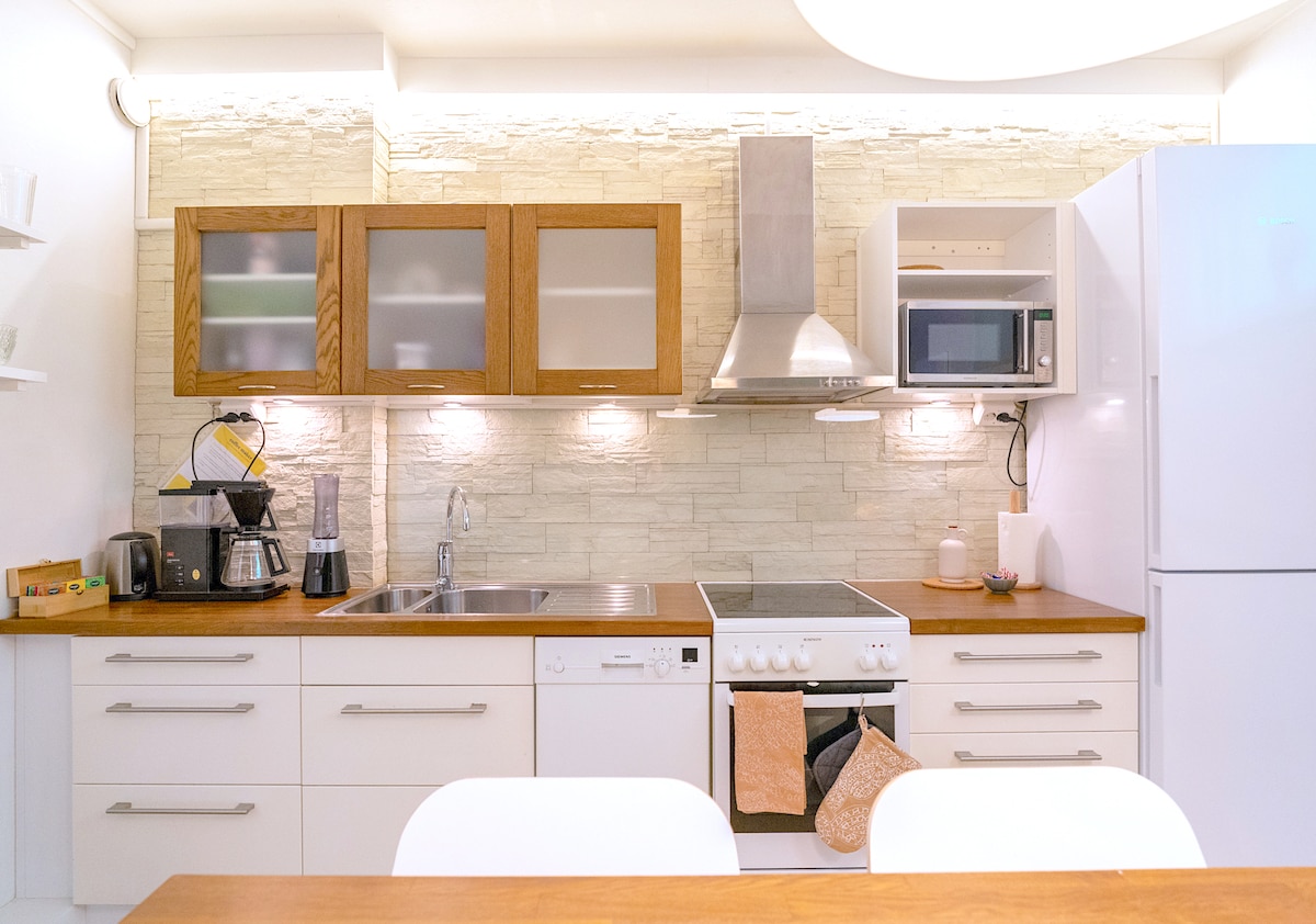 У спальні комфортабельне двоспальне ліжко, широкий диван-ліжко у вітальні, 2 запасні матраци та дитяче ліжечко для найменших. Охолодження кондиціонера робить квартиру приємно прохолодною навіть в літню спеку. Чудовий ресторан у тій самій будівлі та багато чудових місць, де можна поїсти неподалік. Театри, фільми, концертні зали, зал біля басейну, бібліотека Metso по сусідству, Särkänniemi та Nokia Arena в пішій доступності. 15 хвилин пішки до залізничного та автобусного вокзалів або сідайте на трамвай за кілька хвилин.