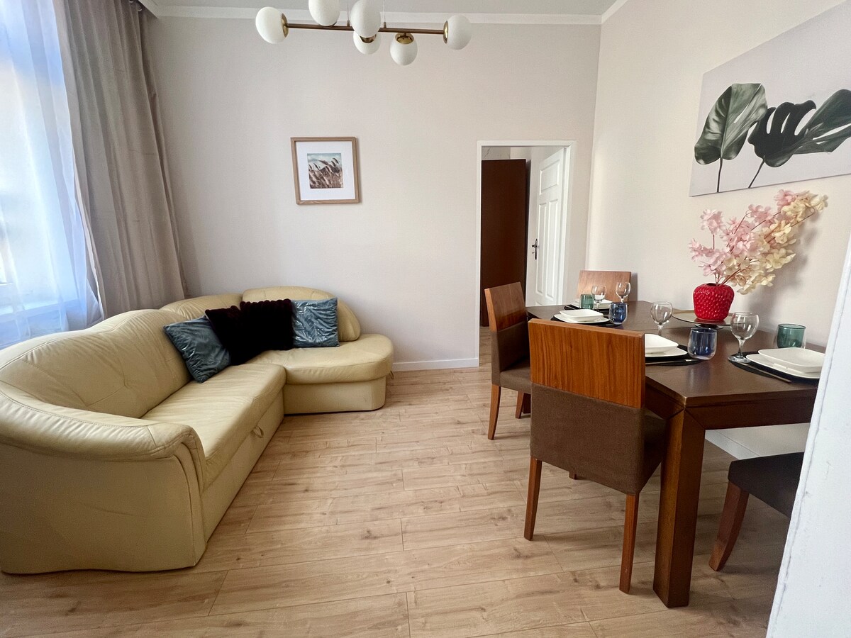 Квартира оформлена в яскравому затишному стилі. Він розташований на першому поверсі в затишному кварталі. Вона складається з вітальні з кухнею та двох окремих спалень. В одній є двоспальне ліжко, в іншому - односпальне ліжко, яке можна розкласти в двоспальне ліжко Великий диван-ліжко у вітальні також підходить для сну. Квартира з балконом у тихому куточку житлового комплексу Przyjaźń.