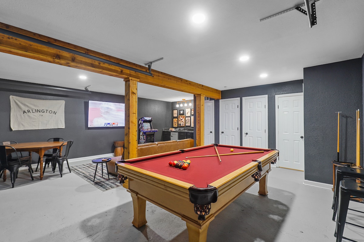 Find out why our guests keep coming back! Relax by the pool in one of many lounge chairs. Or chill out in the hot tub. Game room with Arcade games, pool table, foosball, darts, blackjack table. Outside Axe throwing game. 1 King, 2 queens, 1 Queen Sofa Bed, & two twins (one is a roll around). 12 Miles to Stockyards. 14 miles to ATT stadium. 13 miles to DFW airport. 3 miles to Iron Horse Golf Course. 5 mins to grocery stores. BBQ grill, Fire Pit & family water park 2 miles.