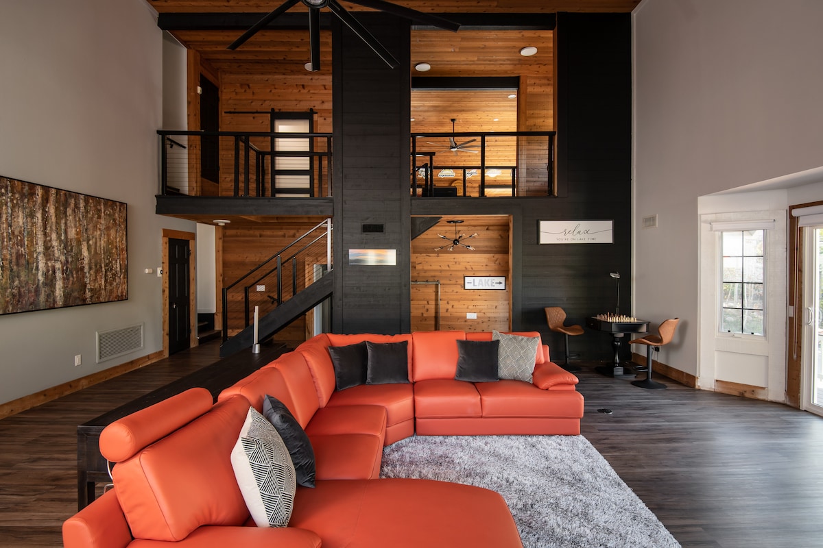 Відпочиньте у своєму класичному трикутному бунгало, розташованому над озером Ерроугед. Цей вражаючий триповерховий зруб має стіну зі скляних вікон, що відкривають вид на озеро та ліс майже з кожної кімнати. Насолоджуйтеся затишними ночами біля кам’яного каміна, кавою на просторій терасі на сході сонця або спостереженням за зірками з огородженого двору – ідеально підходить для безпечних прогулянок дітей або цуценят. Цей зруб із просторою вітальнею площею 2100 кв. футів поєднує дизайн середини століття з сучасним комфортом.