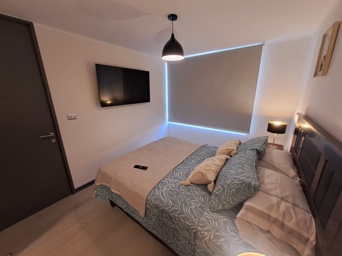 🎶 Ідеально підходить для концертів: сучасні апартаменти поруч із театром Кауполікан, з власною парковкою та станцією метро Parque Almagro всього в 2 хвилинах ходьби. Центральне, безпечне та зручне розташування: недалеко від супермаркетів, аптек, університетів та парку Альмагро. Ідеально підходить для відпочинку після шоу або пішої екскурсії по Сантьяго. Вона включає Wi-Fi, обладнану кухню та доступ до основних туристичних об’єктів міста.