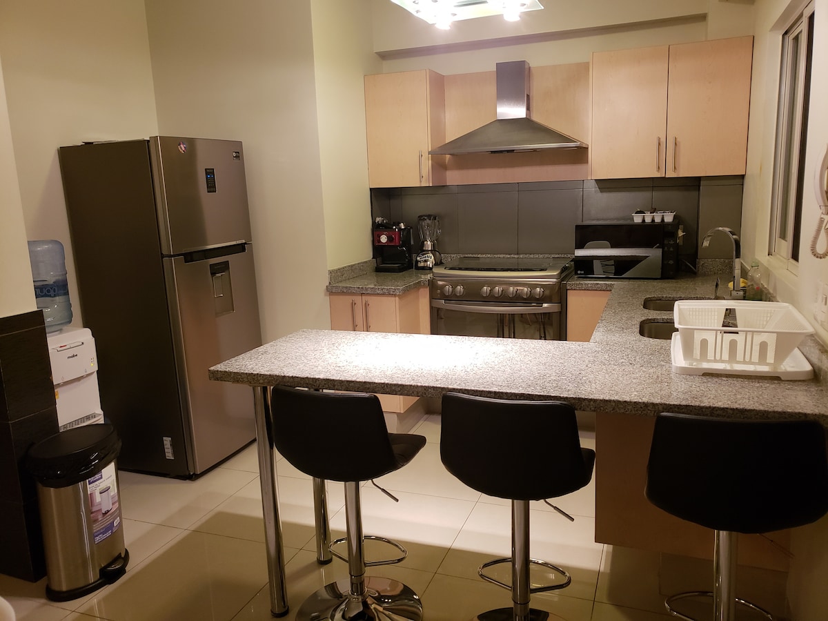 Простора, затишна квартира, ідеально підходить для роботи з чудовим Інтернетом! 100 Megas. Дві великі спальні з кондиціонером, повноцінними ванними кімнатами, гардеробною та стельовим вентилятором. Телевізійна кімната, де може спати п 'ята людина. Вітальня+їдальня з великим вікном і 4 портативними вентиляторами для пересування по будь-якій зоні. Повністю обладнана кухня з посудом на 6 осіб. Попередні гості похвалили нашу квартиру за стильний декор, комфортабельні зручності та чудове розташування поблизу яскравих кафе та ресторанів.
