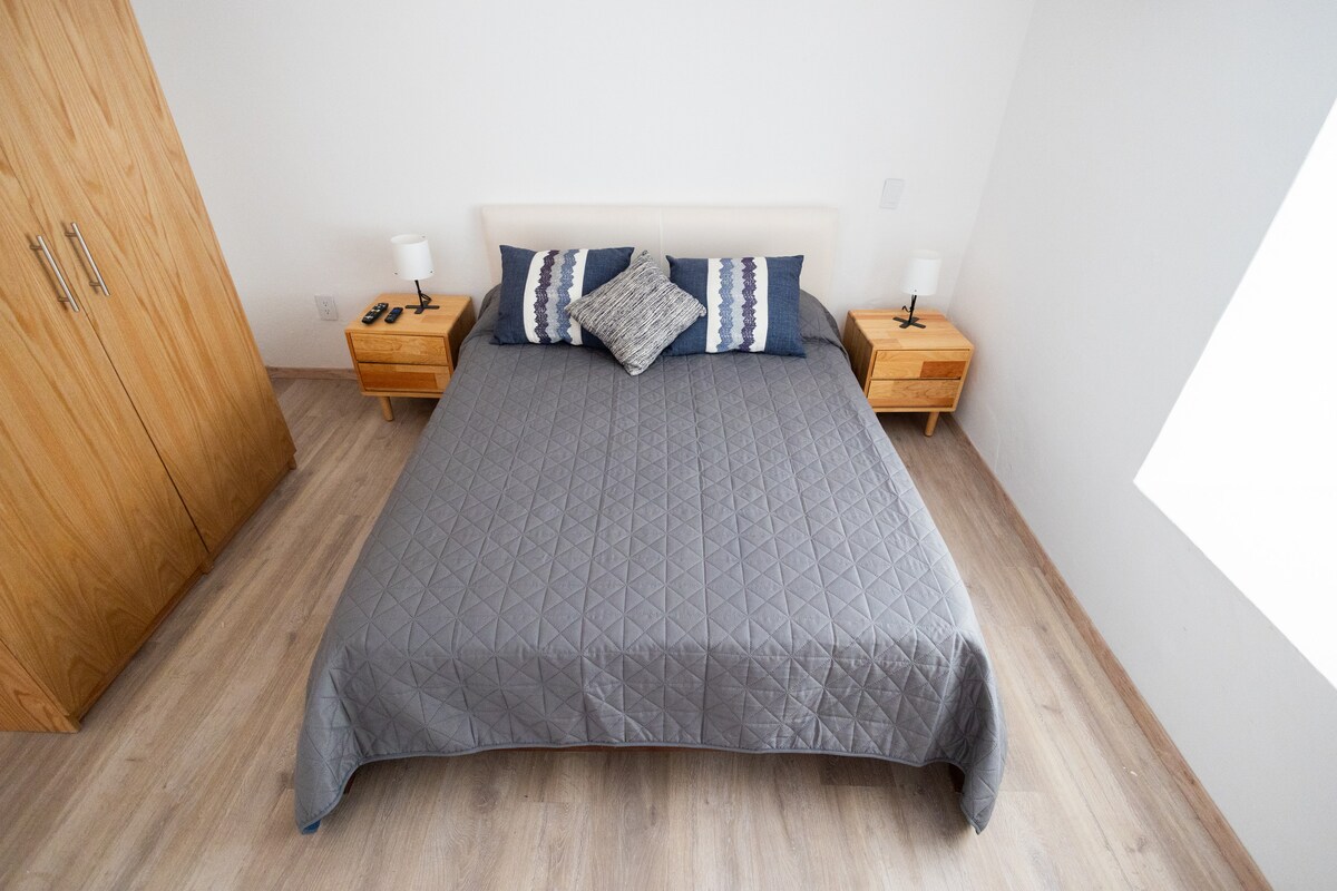 Ідеально підходить для пар і сімей: двоспальне ліжко розміру King size, диван-ліжко, окремі ванні кімнати та повністю обладнана кухня. Розташування на першому поверсі для швидкого та легкого доступу. Насолоджуйтеся дахом із басейном і приголомшливим краєвидом на центр міста. До вартості входять швидкий Wi-Fi, Smart TV та стельові вентилятори. Відчуйте Гвадалахару зі стилем та привілейованим розташуванням!