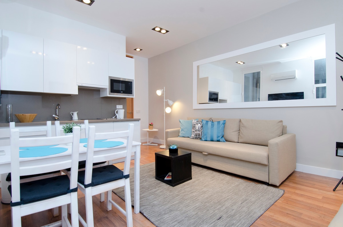 Amazing 1 bedroom / 1 bathroom fully renovated apartment in the very best location of Madrid. With Air conditioned both in the bedroom and the living room it sets the best temperature either for summer or winter. It's perfect to work because it has desk to work and amazing wifi. Our place is just steps in La Gran Vía (The main road for shopping) , Plaza del Sol (The center center of the city), Fuencarral street and to El Corte Inglés (Biggest department store), and Puerta de Alcalá.