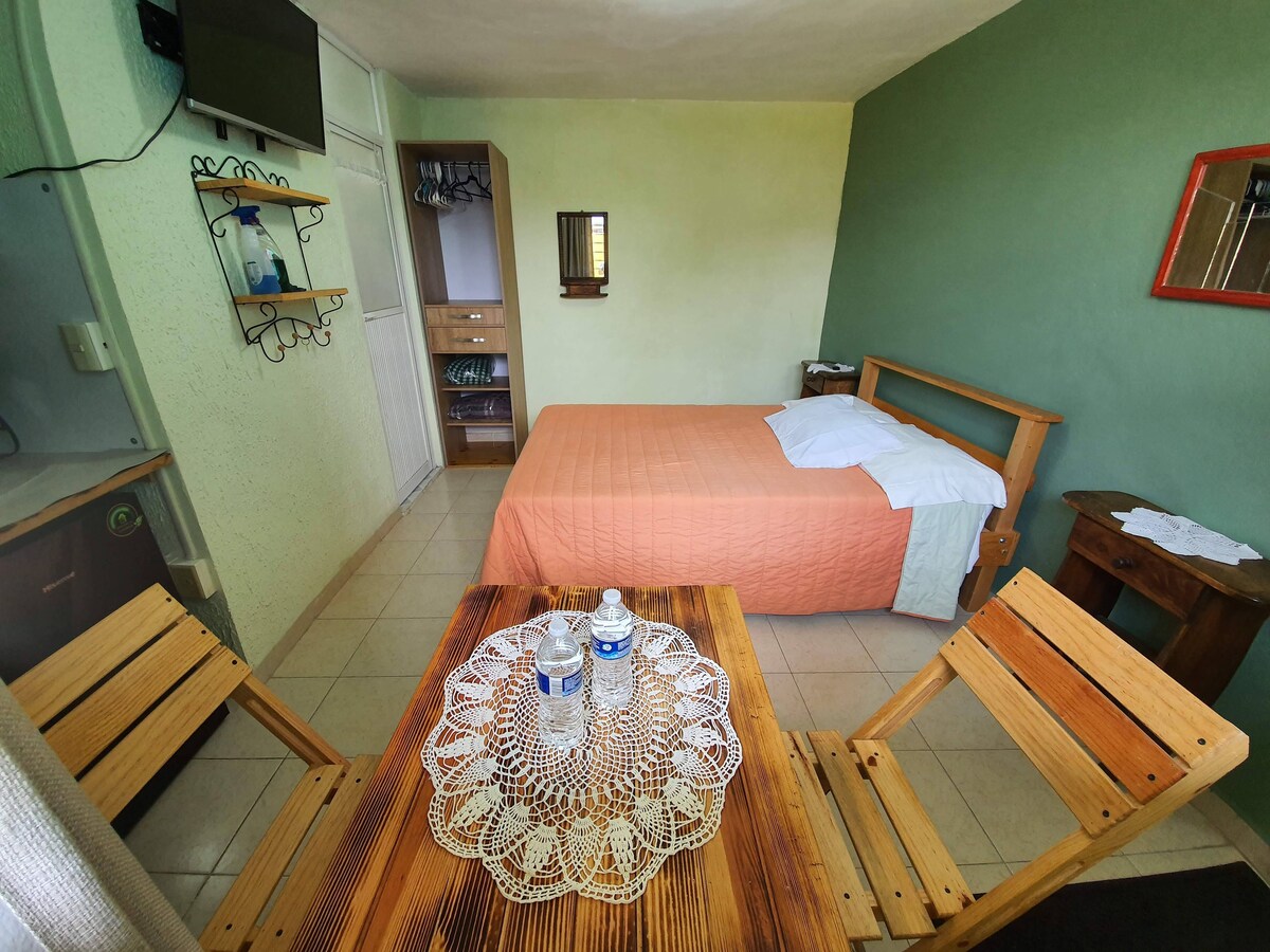 Житло є незалежною квартирою головного будинку, з власним входом. Вона має одну кімнату (2 особи, двоспальне ліжко); 1 студію (з обладнанням для сніданку, столом, стільцями та книжковими полицями); міні-кухню (без плити, тільки з електричною плитою); повну ванну кімнату; і 1 паркувальне місце. Розташоване на півдні Мехіко, в 5 хвилинах від музею Долорес Ольмедо та легкорельсового транспорту Noria, в 10 хвилинах від знаменитих трахінерів і квіткового ринку.