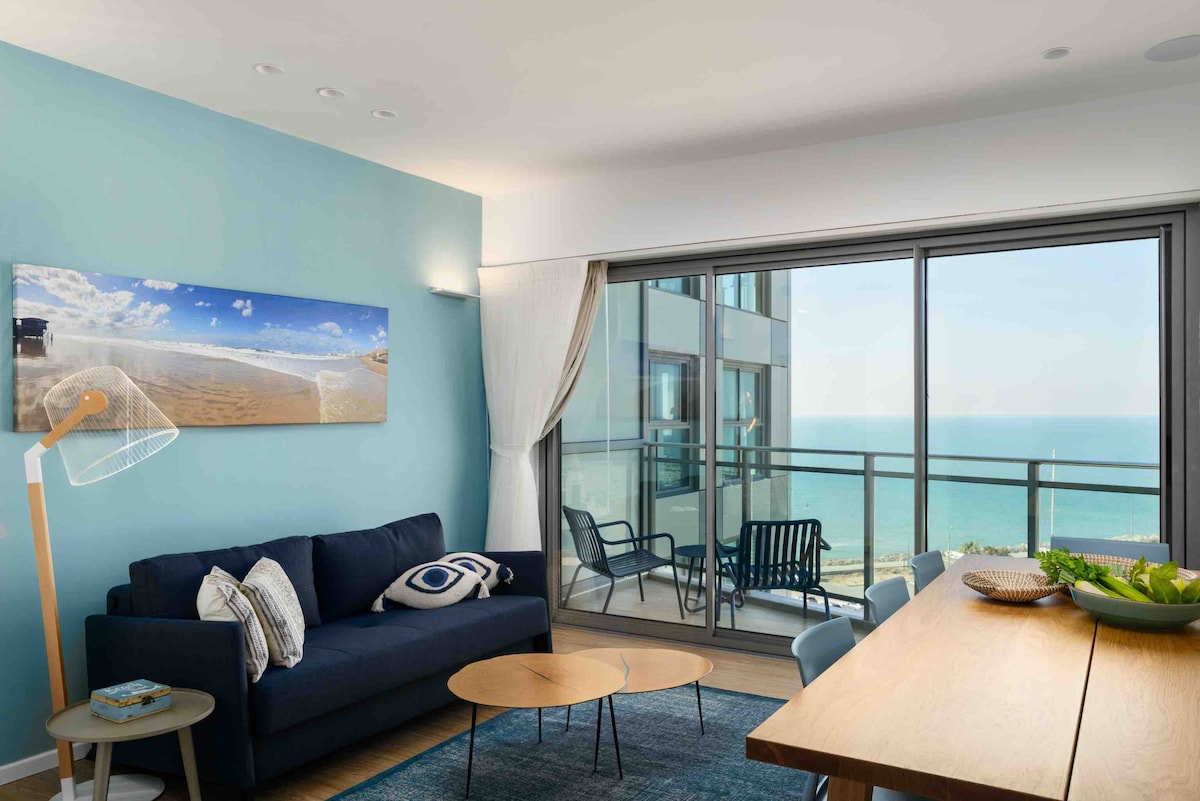 Newly redesigned & fully remodeled stunning 1 bedroom &balcony apartment, accommodates up to 4, direct & ocean view, fully equipped kitchen, 65" +50"4K HD smart TVs, free WiFi, free parking, 24/7 reception/security at Okeanos at the marina building, adjacent to Hertzeliya's beautiful beaches, minutes from Tel Aviv. Perfectly situated few min walk to restaurants & shops at the marina, less than 5 minutes from Hertzeliya's Silicon Valley, 30-40 min to Caesarea golf course, 45-55 to Jerusalem.