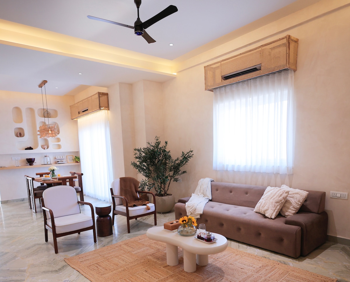 * Саноброблені сертифіковані* ОЛИВКОВІ апартаменти - помешкання, відзначені нагородами! Дизайнерський приватний 1BHK у Гачібоулі з садом на терасі, парковкою та ліфтом, всього в 5 хвилинах їзди від міста Хітех, лікарні AIG та лікарні догляду. Найкраще для роботи з дому - ліжко king-size у спальні, робочий стіл,ванна кімната, диван для сидіння та обідній стіл у вітальні та повністю обладнана кухня з газовою плитою,холодильником, мікрохвильовою піччю, посудом тощо. Добова оренда «все включено» - Wi-Fi, телевізор TataSky, прибирання, пральна машина, комунальні послуги, резервне живлення.