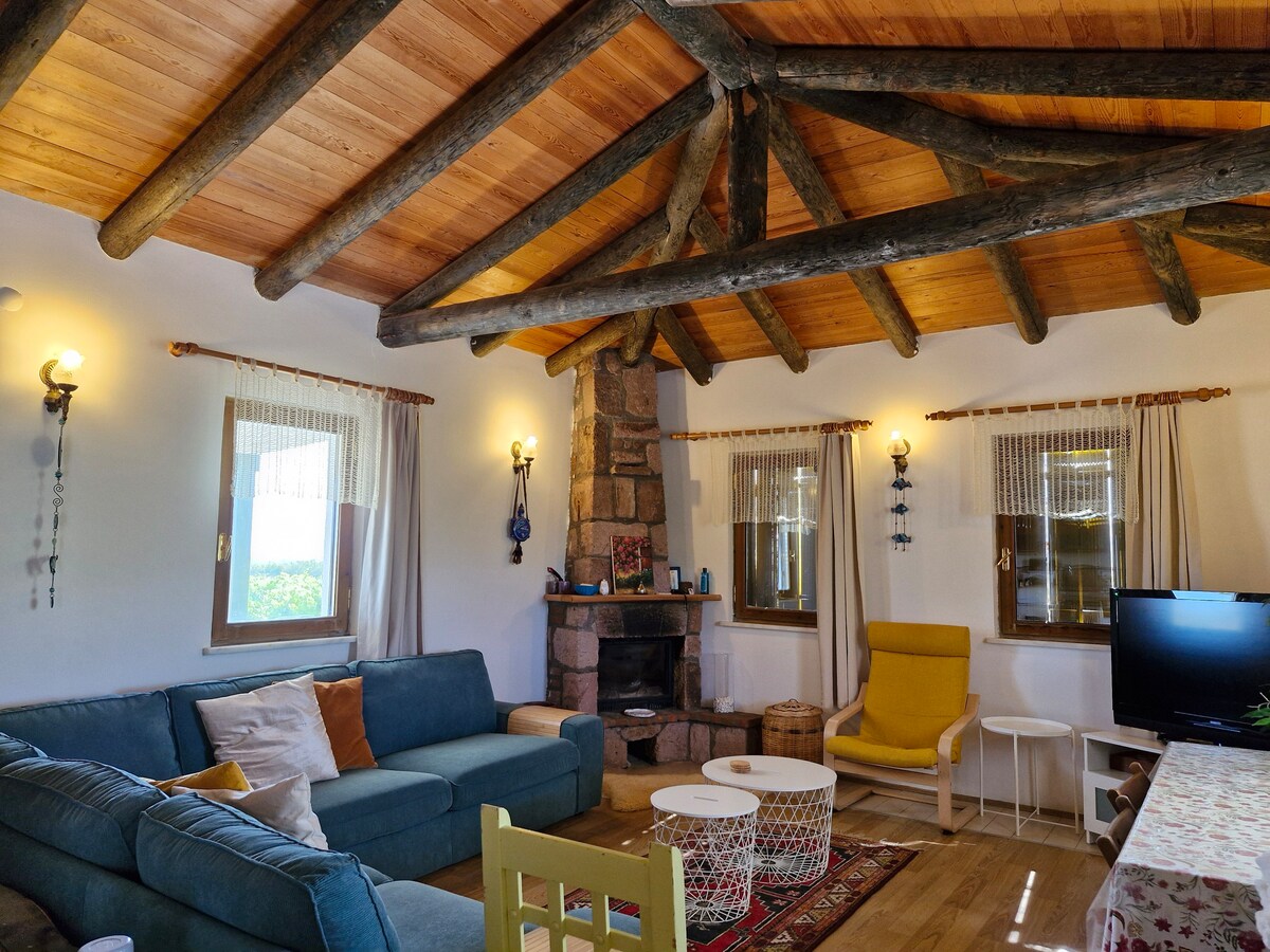 Ви знаходитесь в одному з найбільш унікальних місць Бозкаада з 360-градусним видом. Вітряки та види на захід сонця прямо перед вами. Ви також можете спостерігати схід сонця і повний місяць вихід з вхідного ганку. На гойдалках в саду можна випити ранкову каву з видом на острів. Якщо ви приїхали взимку, ви можете насолодитися ним перед каміном. Весь 5-акровий сад і будинок - ваш. Ви знаходитесь в правильному місці, щоб відпочити головою!