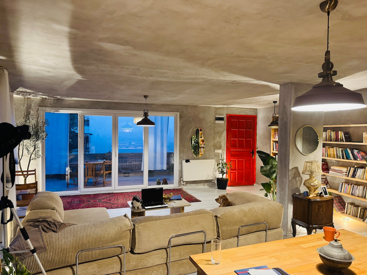 Private 3-story home with two balconies and a mezzanine offering 180° panoramic Marmara views. Bright, artistic, and perfect for long stays. Wake up to sunlight and sweeping Marmara Sea views. The mezzanine offers a 180° panorama for reading or relaxing, and a cozy fireplace invites you to unwind on cooler evenings. Two balconies and spacious rooms make the entire house yours to enjoy in privacy. Designed by three generations of architects, it blends artistic character with comfort and charm.