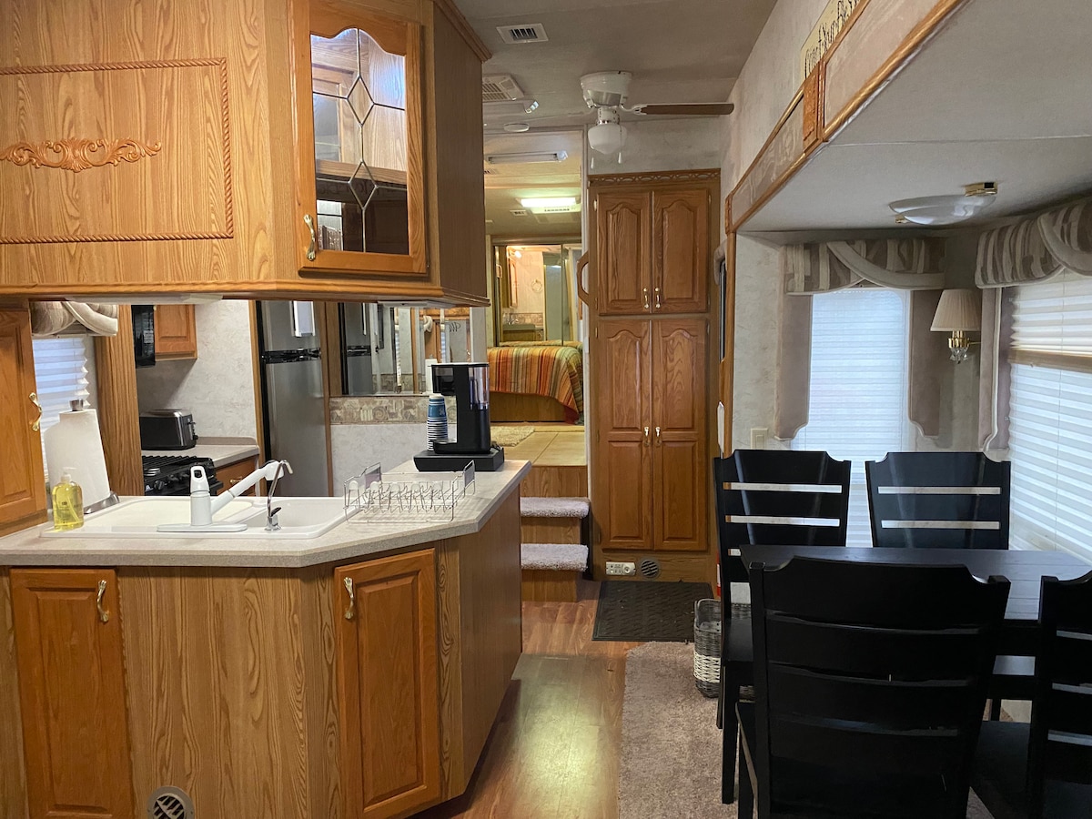 Ви не забудете час, проведений у цьому незабутньому місці. Новий автобудинок з двоповерховим ліжком, нижнє ліжко повнорозмірне, а верхнє – двомісне. У головній спальні є ліжко розміру «queen size». На кухні є великий холодильник/морозильна камера. На кухні також є одна чашка Keurig, тостер і посуд. Ванна кімната простора з достатньою кількістю місця для зберігання речей і оснащена мочалками/банними рушниками та рушниками для рук. На вулиці є душ на відкритому повітрі, сковорідка та міні-холодильник. Ми дружні до собак. На жаль, ми не можемо приймати котів.