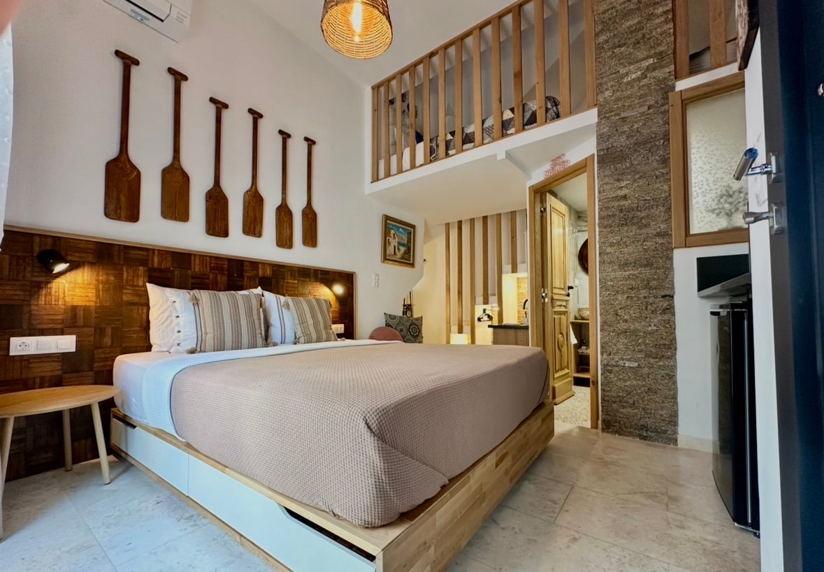 The Gold Room is a cosy ground floor studio for families or groups of up to four. There is a kitchen and dining table, a comfortable double bed and two single beds on the mezzanine level. Please note that the mezzanine has a low ceiling. Step outside to relax in chairs along the quiet alley, where the only traffic is from pedestrians and the occasional moped. There is often a pleasant breeze, making it an inviting spot for a morning coffee or a glass of wine as the day winds down.