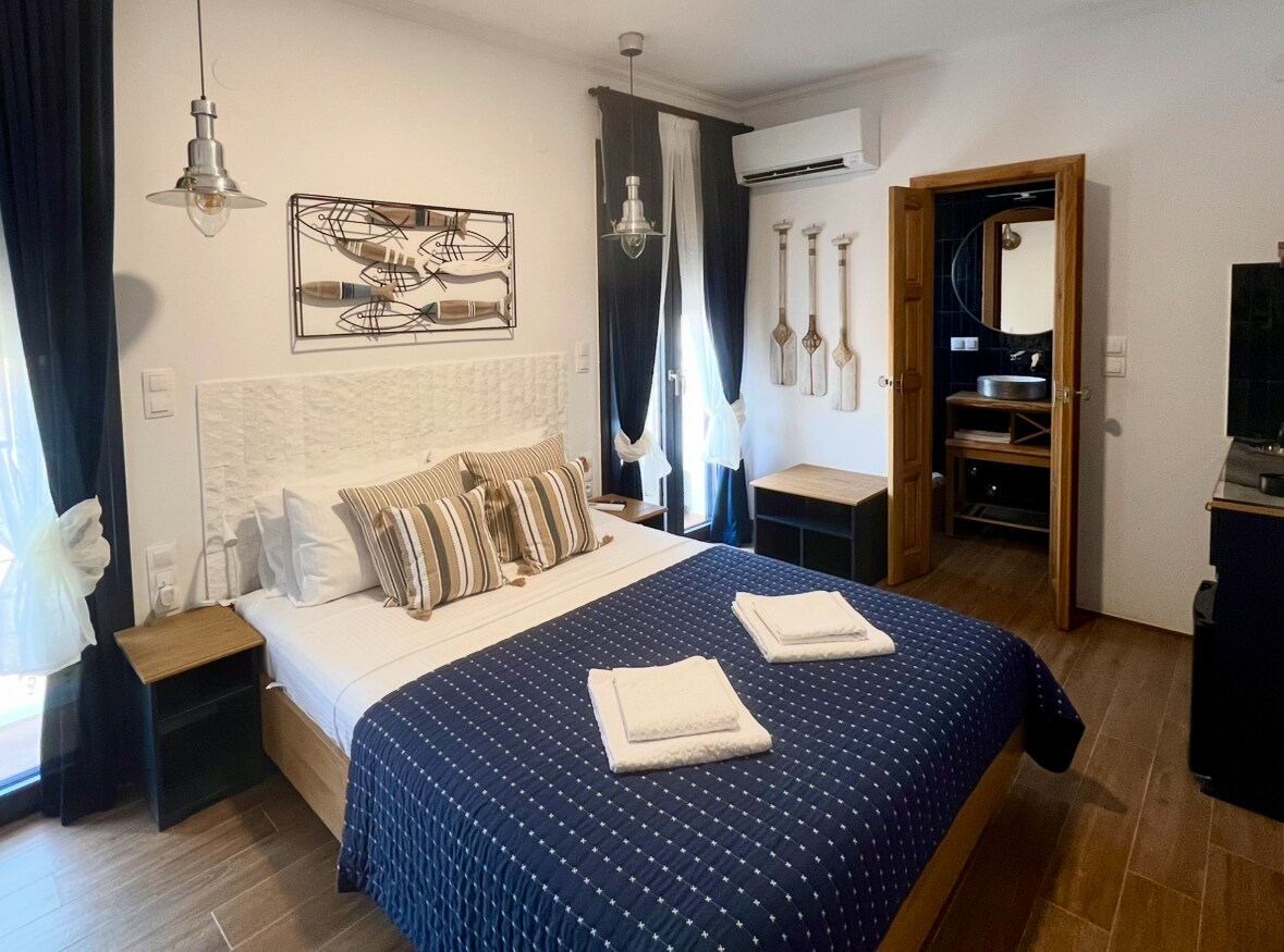 The Black Room offers a quiet, stylish retreat for two. With soft lighting and rich textures, it’s perfect for couples seeking a calm, comfortable space in the heart of Limenas. Located on the street level, the room has a Juliet balcony that opens onto a quiet alley. Just outside, chairs are available for you to sit and enjoy the gentle breeze, where the only traffic comes from passing pedestrians and the occasional moped - ideal for a slow morning coffee or a relaxed evening drink.