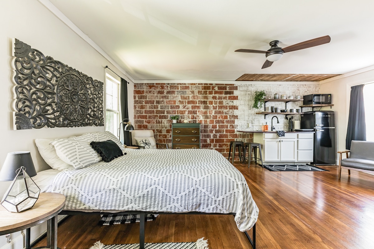 Вам сподобається стиль і зручність цієї квартири-студії з міні-кухнею та повною ванною, розташованою в центрі міста неподалік від вулиці Палафокс і Гарден-стріт. Це ідеальне місце для перебування в центрі міста після шоу в Vinyl Music Hall або ночі танців у кварталі Севільї. Комфортне та добре обладнане помешкання для триваліших бронювань! Прогуляйтеся до всіх місць у центрі міста. Паркування за 12 $ на день у гаражі на Джефферсон-стріт. 1 ліжко «king-size»/1 «queen-size» на 4 спальних місця. **З цього помешкання немає доступу до балкона Palafox.**