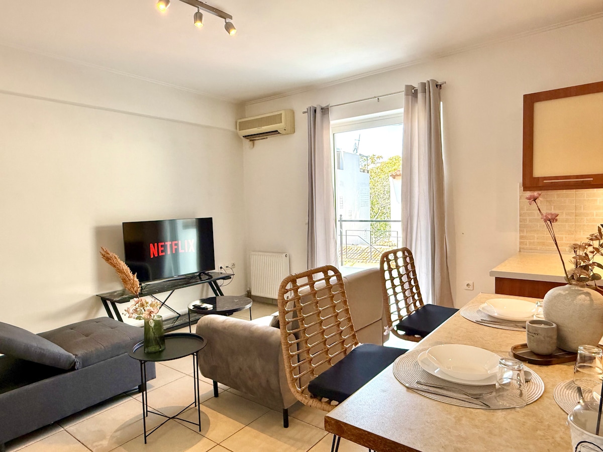 Естетична квартира знаходиться за 400 м від станції метро «Євангелісмос», в туристичній зоні, безпечному районі з високим міським життям. Він розташований за 2 км від Акрополя і ближче до площі Синтагма, Національного саду, стадіону «Панатінаїка» та храму Зевса. Квартира площею 50 кв. м розташована на 4-му поверсі, а з балкона відвідувачі мають гарний вид на гору Іміттос та ліс Кесаріані. Навколо багато гарних кафе та ресторанів. Додаткова плата 15 євро за другий комплект білизни