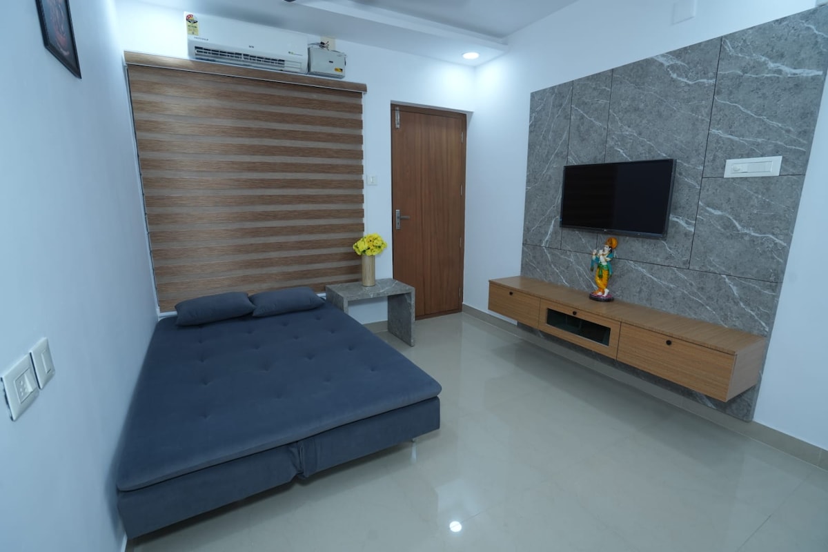 Experience the warmth of a home away from home in this fully furnished 1 bedroom AC apartment in a gated residential building with 24*7 security and private parking. Unwind in our thoughtfully designed space with premium bedding, AC & modern amenities. In addition to a queen bed, we have a floor mattress as well. Take a leisure 10-min walk to the temple or let us arrange a convenient ride for you! As local hosts, we are happy to share insider tips on exploring our charming town.
