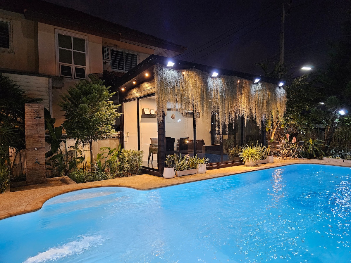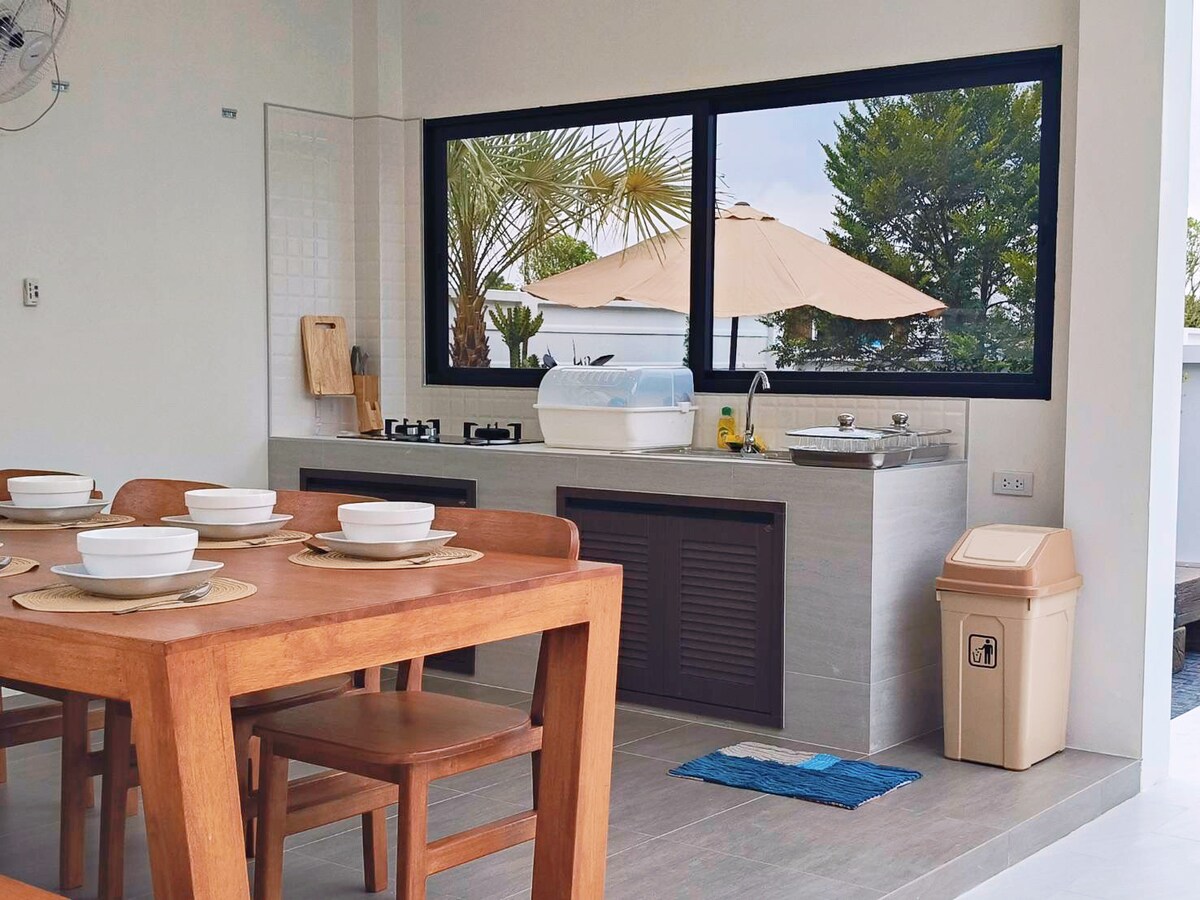 My Home Pool Villa Hat Yai. У помешканні для відпочинку преміум-класу затишно. Відчувається, ніби ви відпочиваєте в будинку з великим басейном, де можна купатися посеред природи. Вдихніть свіже повітря з усіма зручностями. Легко пересуватися. Поруч багато ресторанів. Ви можете замовити їжу.