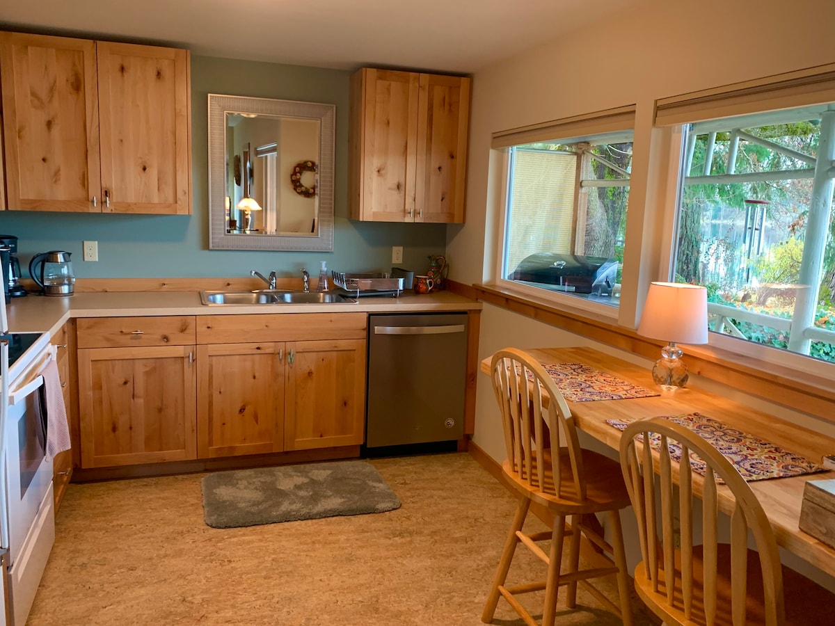 Цей заміський будинок розташований всього в 13 милях від Олімпії, штат Вашингтон, поєднує в собі мистецьке оформлення та сільський шарм навколишнього лісу. Всередині є унікальні дерев 'яні сходи до ліжка в лофті queen-size або спальня преміум-класу внизу. У помешканні є повністю обладнана кухня з холодильником для вина. У ванній кімнаті є унікальний дощовий душ зі СВІТЛОДІОДНИМ освітленням, і не забудьте зануритися в ванну на відкритому повітрі. Це справжній райський куточок лише для вас.