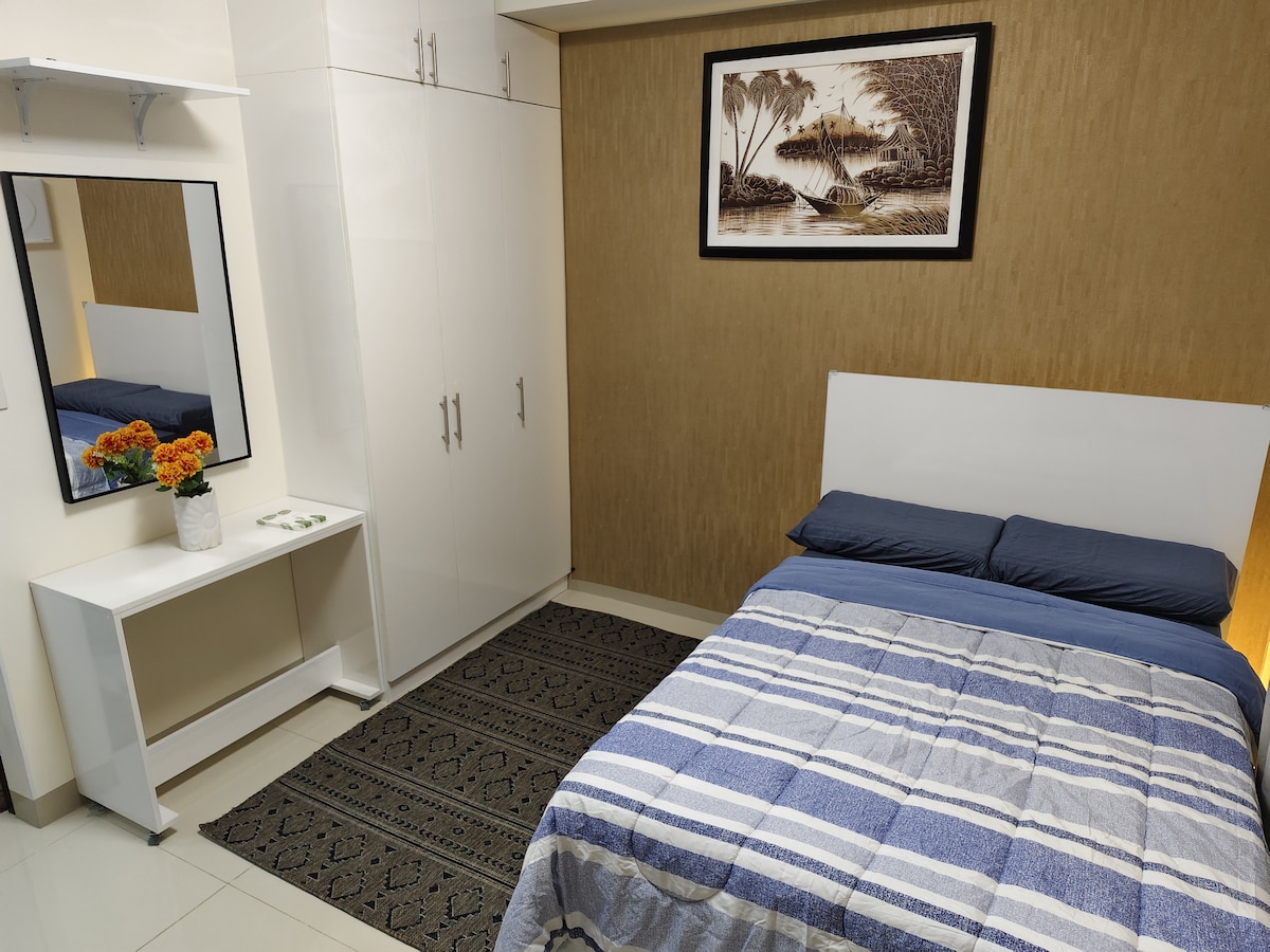 Відпочиньте з сім 'єю в цьому спокійному місці для розміщення. - підходить максимум для чотирьох осіб - вид на гори/ місто; - басейн; - обідній стіл; - 40-дюймовий телевізор Android із плоским екраном - можна готувати (кондитерська); - кухонне приладдя; - водонагрівач для питної води; - кондиціонер; - простора шафа; - душ у ванні; - вогнегасник; - пожежний спринклер; - домашні тварини заборонені. - Немає паркування. - Wi-Fi ( до 50 Мбіт/С) - Холодильник. - Праска для одягу - 3-5 хвилин супермаркет, банки, пральня, м 'ясний магазин, Jollibee, Chowking тощо.