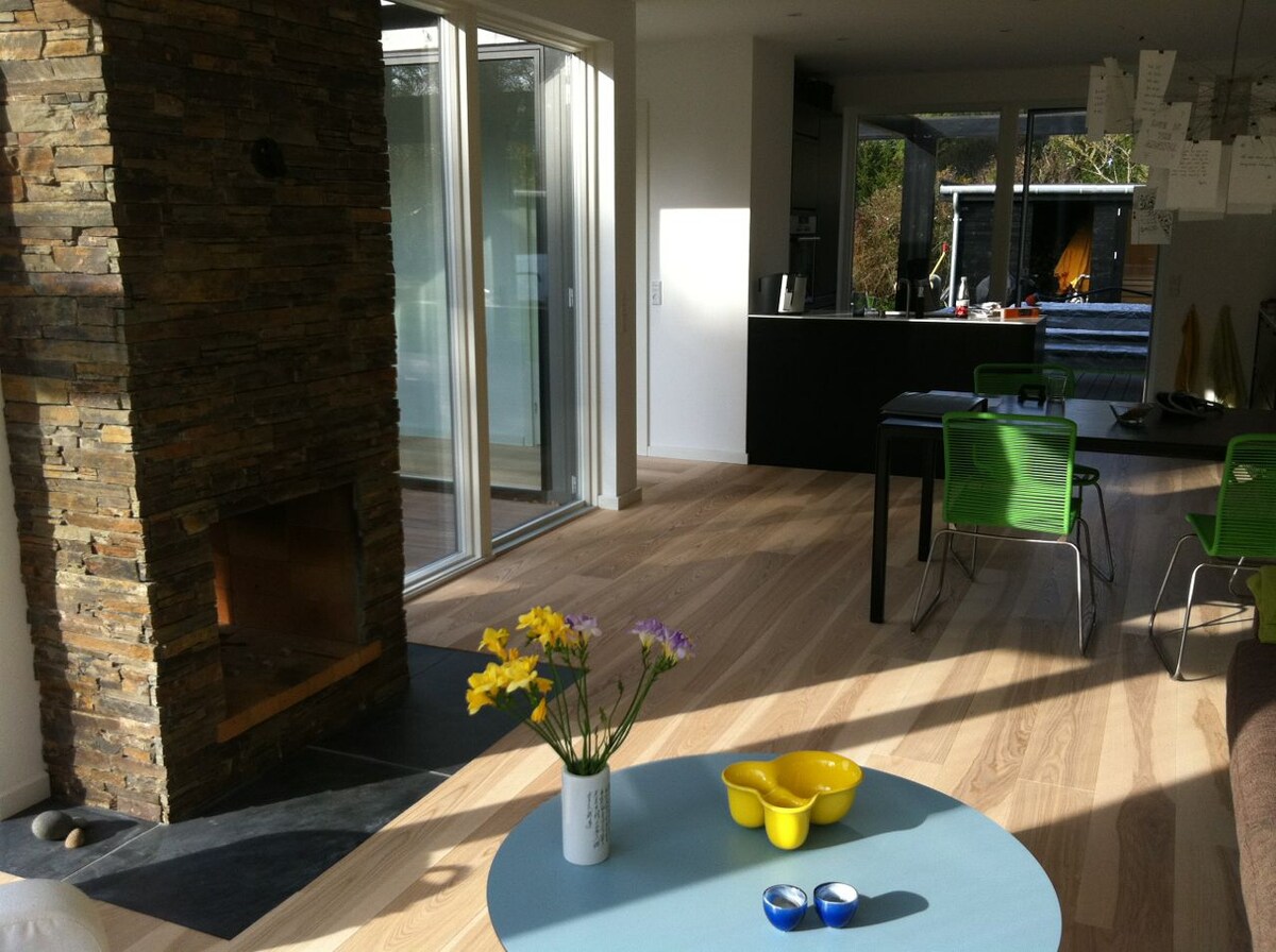 Ліс як сусід і краєвид на поля. Ідеальне святилище далеко від шуму і нас, недалеко від пляжу та заходів. У помешканні є 4 спальні та просторий лофт. Є велика ванна кімната, а також туалет, до якого можна потрапити ззовні, з відповідним душем на відкритому повітрі. Кухня - це столярна кухня з побутовою технікою Miele. Зануртеся в ванну з дикою природою та відвідайте сауну. У будинку всього 5 бездротових динаміків. У кутку саду є чаша для багаття з гойдалками, де вся сім 'я може приготувати хліб на багаттях