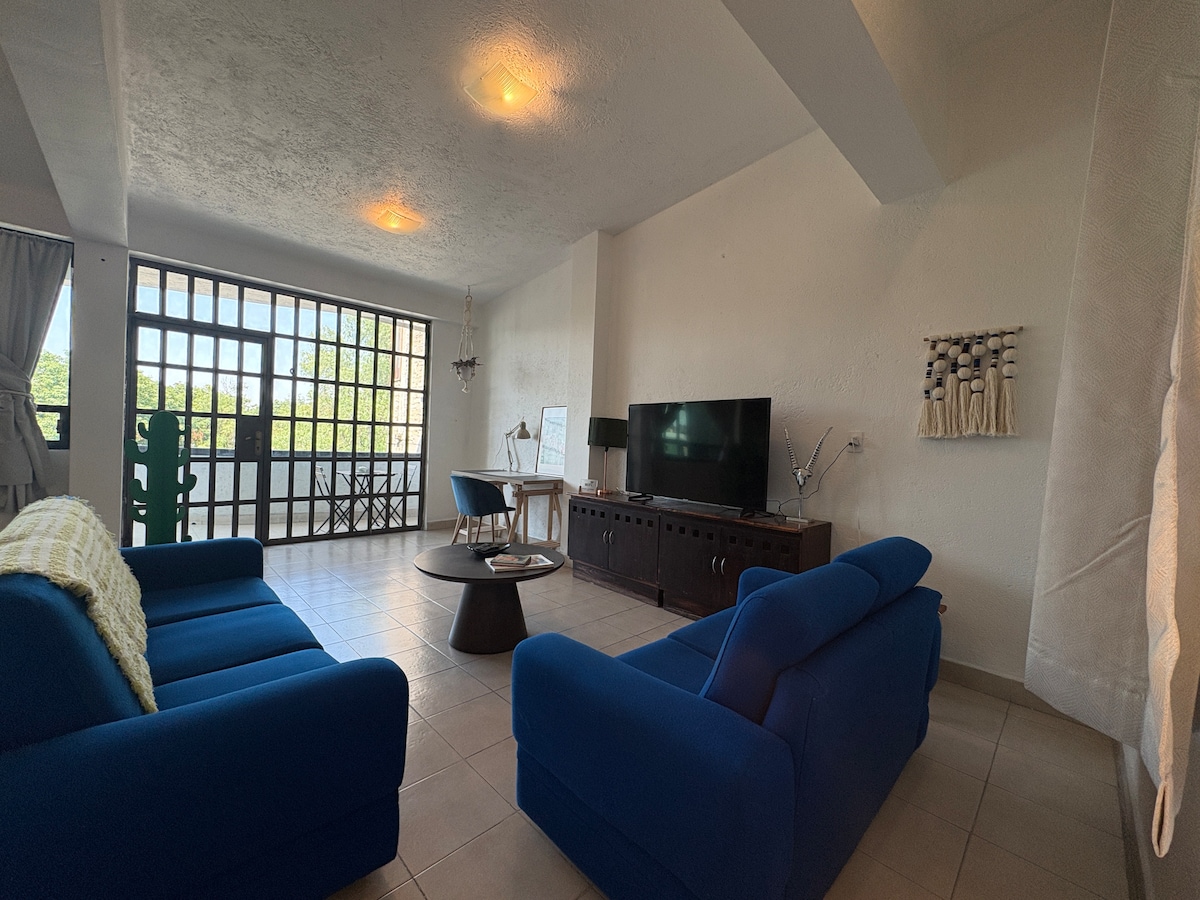 Розслабтеся в цьому затишному та стильному помешканні. Розроблено, щоб зробити ваше перебування максимально приємним. Насолоджуйтеся переглядом фільмів на 85-дюймовому екрані, зручно сидячи на дивані або відпочиваючи в кімнаті. У нас є обладнана кухня та балкон. Вид на квартиру вдень дуже гарний, а вночі він вражає. Будинок розташований перед торговим центром Gran Sur, дуже близько до стадіону Aztec та лікарняної зони
