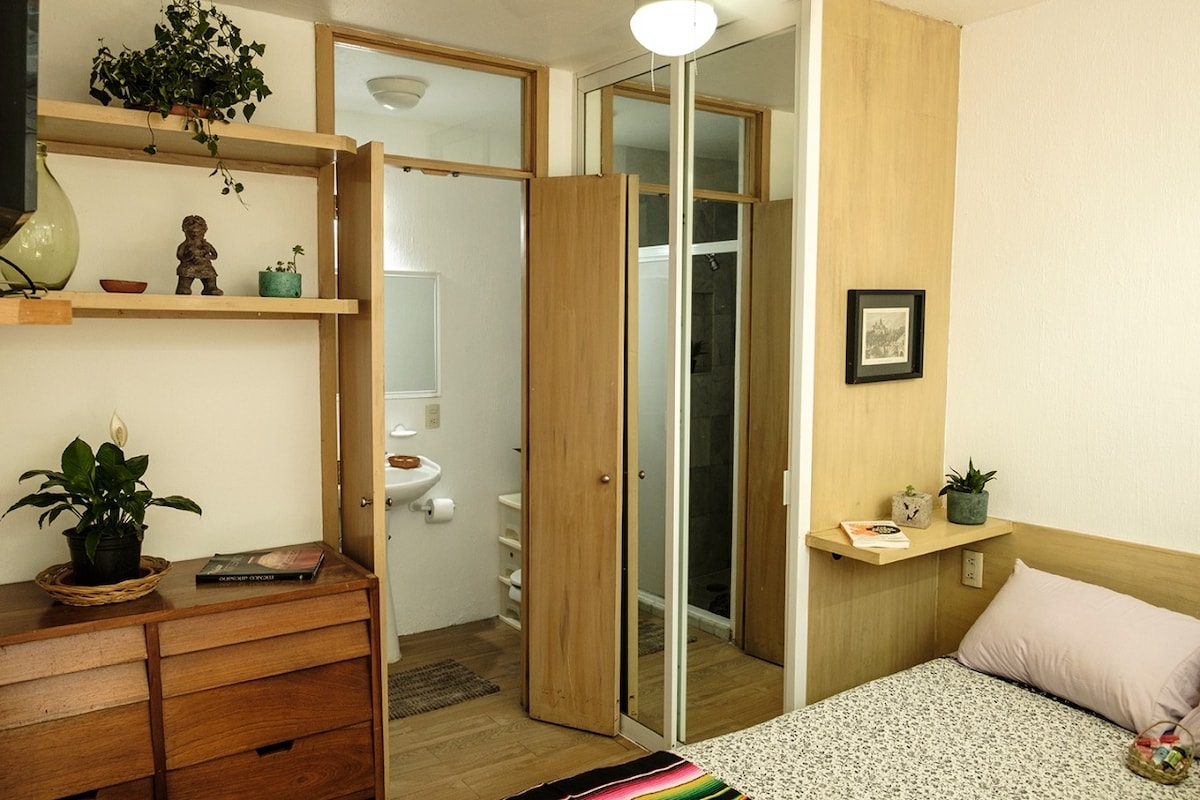 Прогуляйтеся та проведіть чудовий час - вражаюча відправна точка, де різні стилі поєднуються, щоб забезпечити унікальне враження. Сільські меблі, повні кольору, оживляють цю сучасну квартиру. Їхній балкон - це дорогоцінний камінь. Квартира-студія - це відкритий простір, де проводяться всі заходи, і ви відчуваєте багато простору, ви завжди можете насолоджуватися посиланням з терасою, яка знаходиться через дуже велике вікно, яке забезпечує багато освітлення внутрішнього простору та вражаючий вид на місто, це стане вашим помешканням, і ми найбільше бажаємо, щоб ви насолоджувалися ним у повному обсязі, ми чекаємо на вас!! На першому поверсі розташований Міський сад, де можна насолодитися різноманітними лікарськими рослинами, їжею, а також виготовити органічні культури для особистого використання та збагачувати своє перебування. Ми рекомендуємо вам насолоджуватися ним, оскільки це дуже гарне помешкання, яке було спроектоване з великою любов 'ю, ми б хотіли, щоб ви жили в ньому і насолоджувалися ним. Ми чекаємо на вас!!! Для нас ваше перебування та комфорт є найважливішими, і ми будемо уважні до будь-якої потреби, яку ви маєте негайно вирішити, ми чекаємо вас із задоволенням і насолоджуємося нашою квартирою, яка, безсумнівно, є вашим найкращим варіантом Квартира розташована в затишному, культурному та гастрономічному районі, ідеально підходить для знайомства з Гвадалахарою. Він знаходиться в трьох кварталах від Mercado Juárez або Mercado México, а в 20 хвилинах ходьби від історичного центру. Ми рекомендуємо вам пересуватися містом і знайомитися з ним пішки, квартира ідеально розташована, щоб відкрити для себе Гвадалахару, дуже близько до історичного центру, Пасео Чапультепек, в тихому, культурному та гастрономічному районі. Багато пам 'яток нашого прекрасного міста можна насолодитися, не витрачаючи гроші на будь-який транспорт. Відчуття життя в квартирі дуже приємне та затишне, коли ви відкриваєте вікна, а помешкання інтегроване з терасою, вам там дуже сподобається. Уночі з тераси можна спостерігати за зйомками літаків, і це видовище, яким ви можете насолоджуватися. На вулиці свободи або в околицях ринку Хуарес (який з тераси, повернувши ліворуч, ви побачите його в 2 кварталах), ви можете насолоджуватися смачними сніданками в декількох кафе, величезна більшість мають тераси з деревами та рослинами, ви відчуєте дуже приємні та затишні моменти.