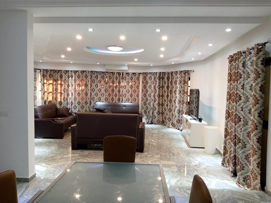 Шикарна нещодавно відремонтована вітальня з двома спальнями та охайним декором. Квартира розташована в 200 м від церкви братів-францисканців в Адідогомі і складається з: • вітальня з кондиціонером; • Дві спальні з кондиціонером і суміжними ванними кімнатами • сучасна повністю обладнана та функціональна кухня; • приватна тераса • Туалети для відвідувачів • Плата за оренду гаража включає воду, електроенергію, високошвидкісний Wi-Fi та послуги з прибирання.