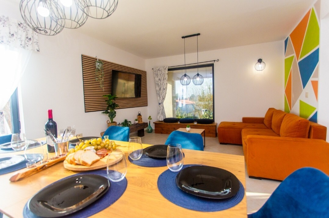 Стильна вілла біля Ровіня з мальовничим басейном, гідромасажною ванною, сауною. Прокиньтеся з панорамним видом на долину. Підходить для пар і сімей, недалеко від парку пригод, Національного парку Бріюні, динопаку, середньовічних міст і місцевої кухні. Це справжня зелена втеча для тих, хто хоче повернутися до природи з усім комфортом сучасного життя. Повністю обладнаний для приготування їжі та розваг у саду площею 2600 кв. м (футбол, швидкісний м 'яч, бадмінтон і басейн) для ваших дітей і близьких.