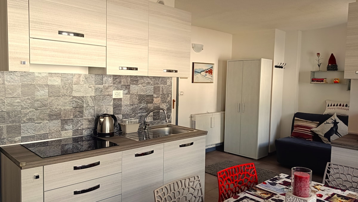 3 студії, нещодавно побудовані. Кухня з посудомийною машиною, універсальною мікрохвильовою піччю, індукційною плитою, повним кухонним посудом та аксесуарами для 4 осіб . Двоспальний диван-ліжко + двоповерхове ліжко для схованки Постільна білизна включена, стіл на 6 місць, супутникове телебачення - Smart TV меблі та шафи + приміщення загального користування для лиж та черевики. Ванна кімната з вікном, душем, біде, умивальником та меблями з постільною білизною на 2/4 осіб . Опалення радіаторів із природним газом за допомогою калорійної стійки