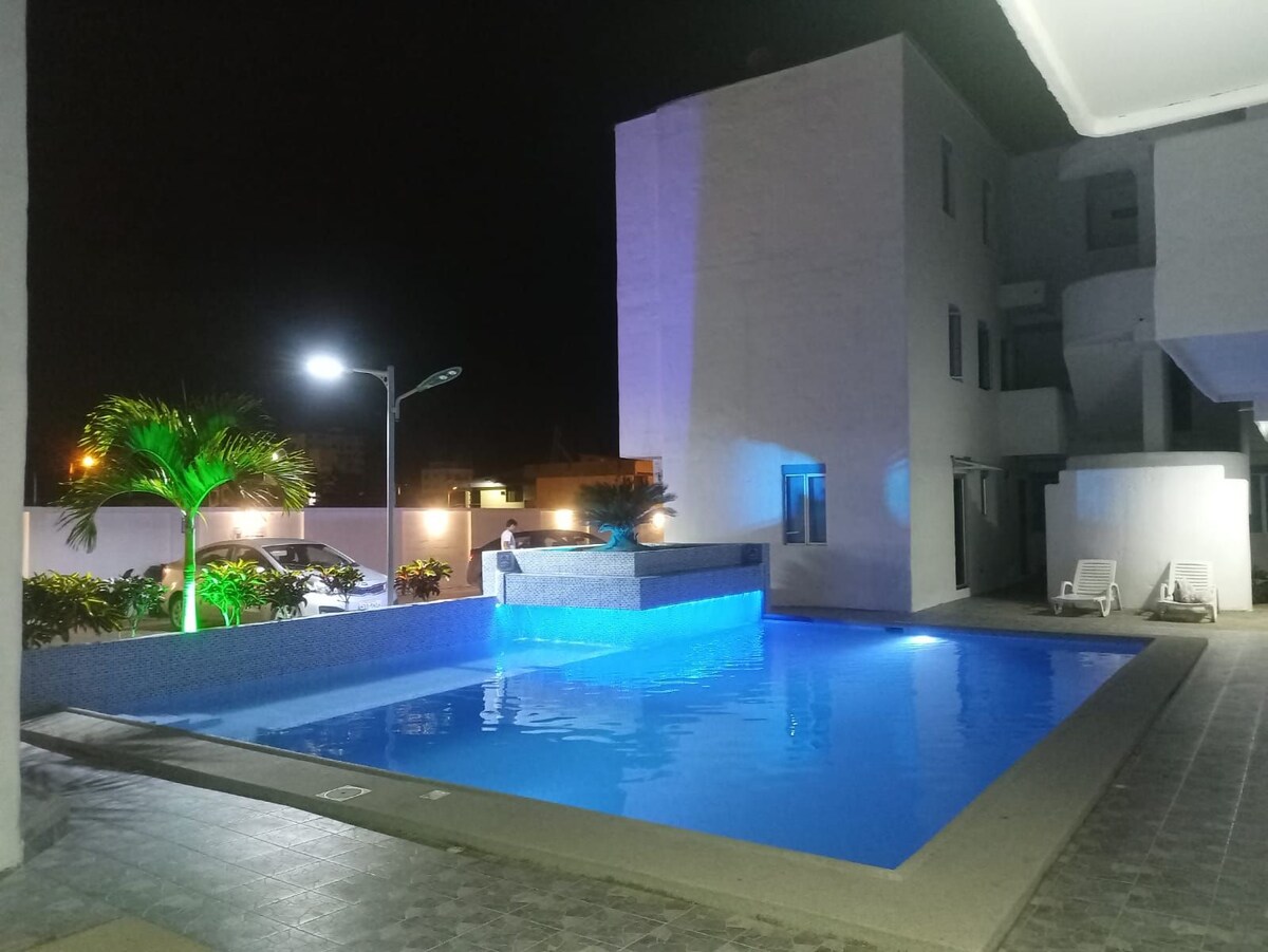 Повністю мебльована та розкішна квартира. Вона включає одну спальню: спальня 1: два ліжка, одне двоспальне та одне двоспальне, 42-дюймовий смарт-телевізор та велику шафу. У вітальні є кондиціонер, два дивани-ліжка, 42-дюймовий смарт-телевізор з Directv. Воно розташоване перед морем. Вона має терасу з видом на океан, басейном для дорослих і дітей, джакузі на 10 осіб, панорамні крісла на березі океану, коктейль-бар і панорамний вид з балкону.