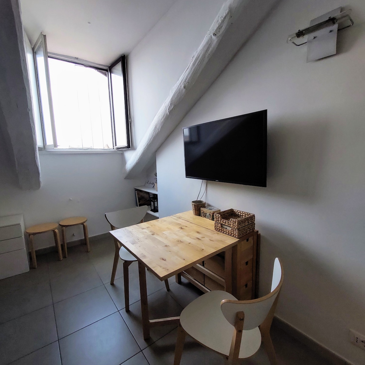 Квартира розташована в будівлі XVIII століття (в стародавньому римському кварталі, найстарішому центрі міста) і дозволяє відвідати місто пішки. Це велика мансардна студія (40 кв. м), з двоспальним ліжком (160x200), диваном-ліжком, що перетворюється на односпальне або двоспальне ліжко (160x200), обладнаною кухонною стіною та великою та світлою ванною кімнатою, також обладнаною пральною / сушильною машиною. Також: ліфт, захисні двері та програмоване опалення.