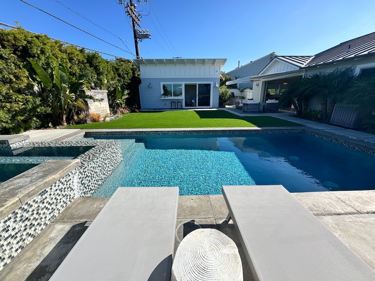 Our backyard casita is a completely detached structure and sits across the yard from a private pool made for relaxation. This little oasis has a waterfall and is surrounded by birds of paradise making it the perfect spot for a mini staycation. The Casita itself has a king size bed, bathroom with a shower and a sitting area with a loveseat and coffee table. There is an indoor outdoor bar top prefect for working on your laptop. We also have a TV with Apple TV, AC, mini fridge and coffeemaker.