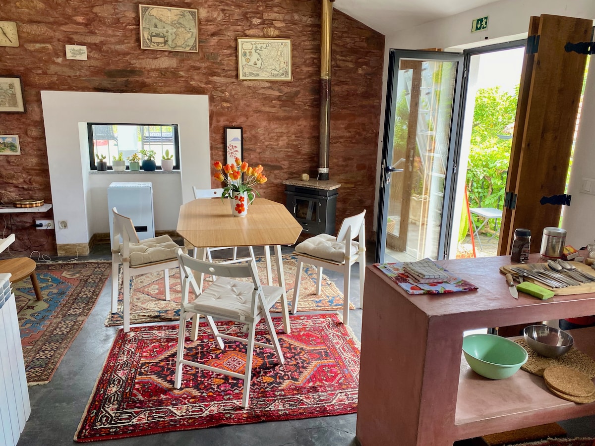 Будинок розташований в долині річки Мондего, на пешій відстані від красивого ізольованого річкового пляжу. Чудове місце для відпочинку від напруженого світу. Відмінно підходить для пари або людини, яка любить простоту, чистоту та тишу природи. У будинку є відкрита кухня та вітальня, мезанін площею 11 кв. м для сну, зовнішній душ, компостний туалет у лісовому саду площею 5000 кв. м з гранітними валунами, природні споруди, скульптури та місця для відпочинку.