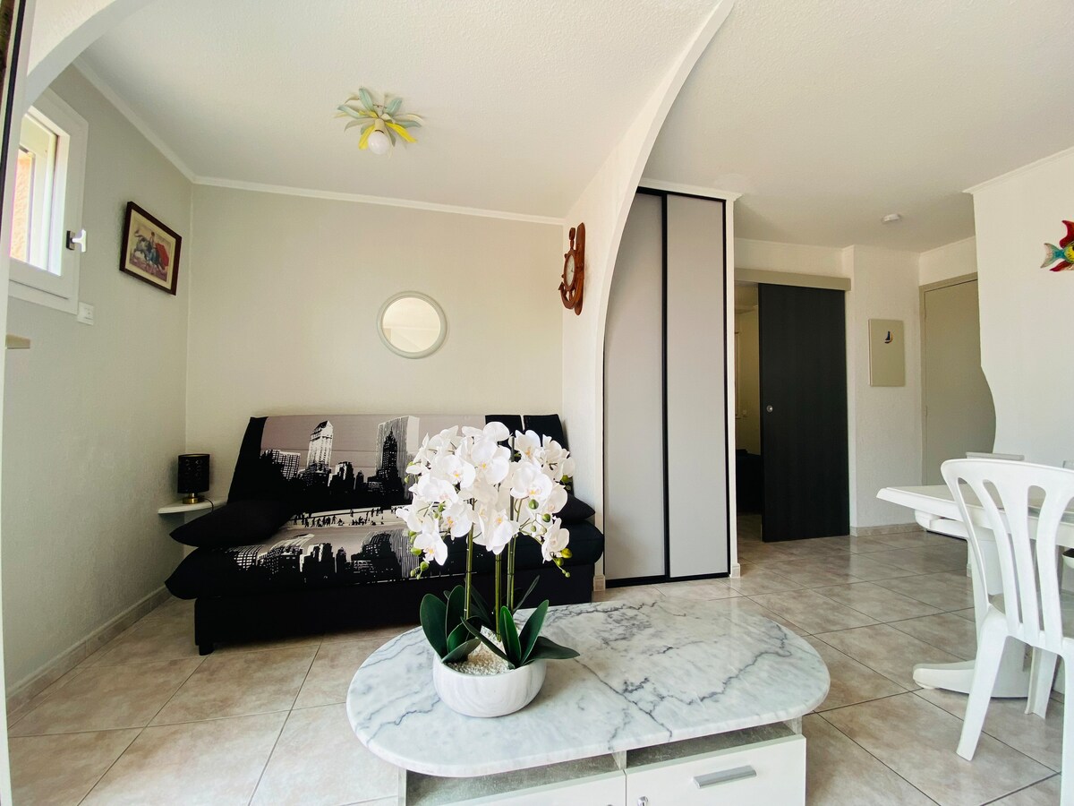 Невелика вілла в резиденції з басейном влітку. Вона розташована на першому поверсі головної кімнати з обладнаною кухнею та невеликою вітальнею, спальнею з двоспальним ліжком 120 см , пральнею та ванною кімнатою - туалетом. Нагорі - вітальня з телевізором , диваном та секретарем для дистанційної роботи. У помешканні є Інтернет (в прямому ефірі та телевізор), пральна машина, посудомийна машина. Тихий, помешкання має екстер 'єр поза полем зору з видом на південь.