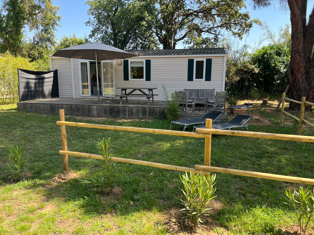 Приходьте і насолоджуйтеся місцем для відпочинку, це чарівне комфортне бунгало. Насолоджуйтеся красивою терасою з барбекю та шезлонгами для відпочинку. У вашому розпорядженні є приватна надувна гідромасажна ванна на 6 осіб (з 01.10 по 30.04), а також приватний стіл для пінг-понгу. У помешканні є безкоштовний басейн. Помешкання Mobil обладнане кондиціонером. 30 хвилин від пляжів Йєра, Надається постільна білизна/рушники, прибирання включено