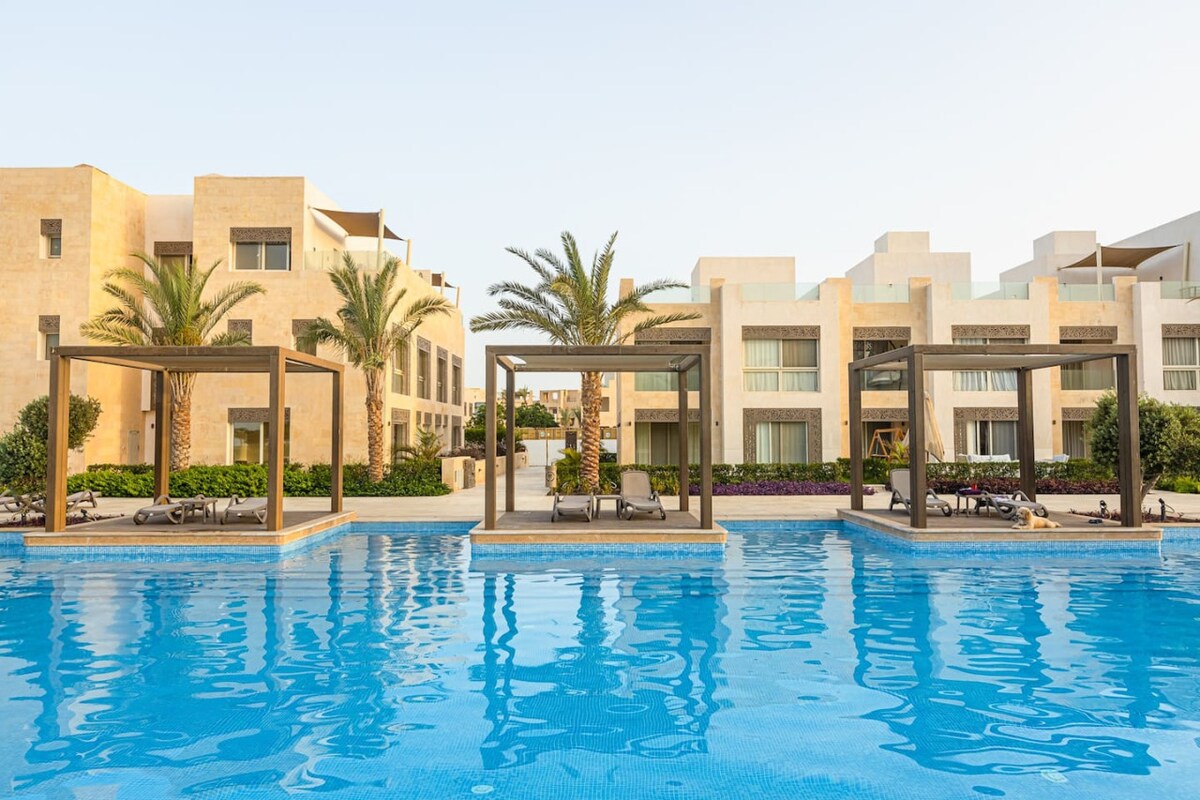Relax Stays | Luxury 85sqm Serviced Apartment @ Fanadir Bay Experience the perfect blend of space and comfort in our oversized 85-meter serviced apartment. Located in the prestigious Fanadir Bay Resort on El Gouna Road, this unit offers a stunning side view of the Red Sea and the sparkling pool from your private balcony or garden.